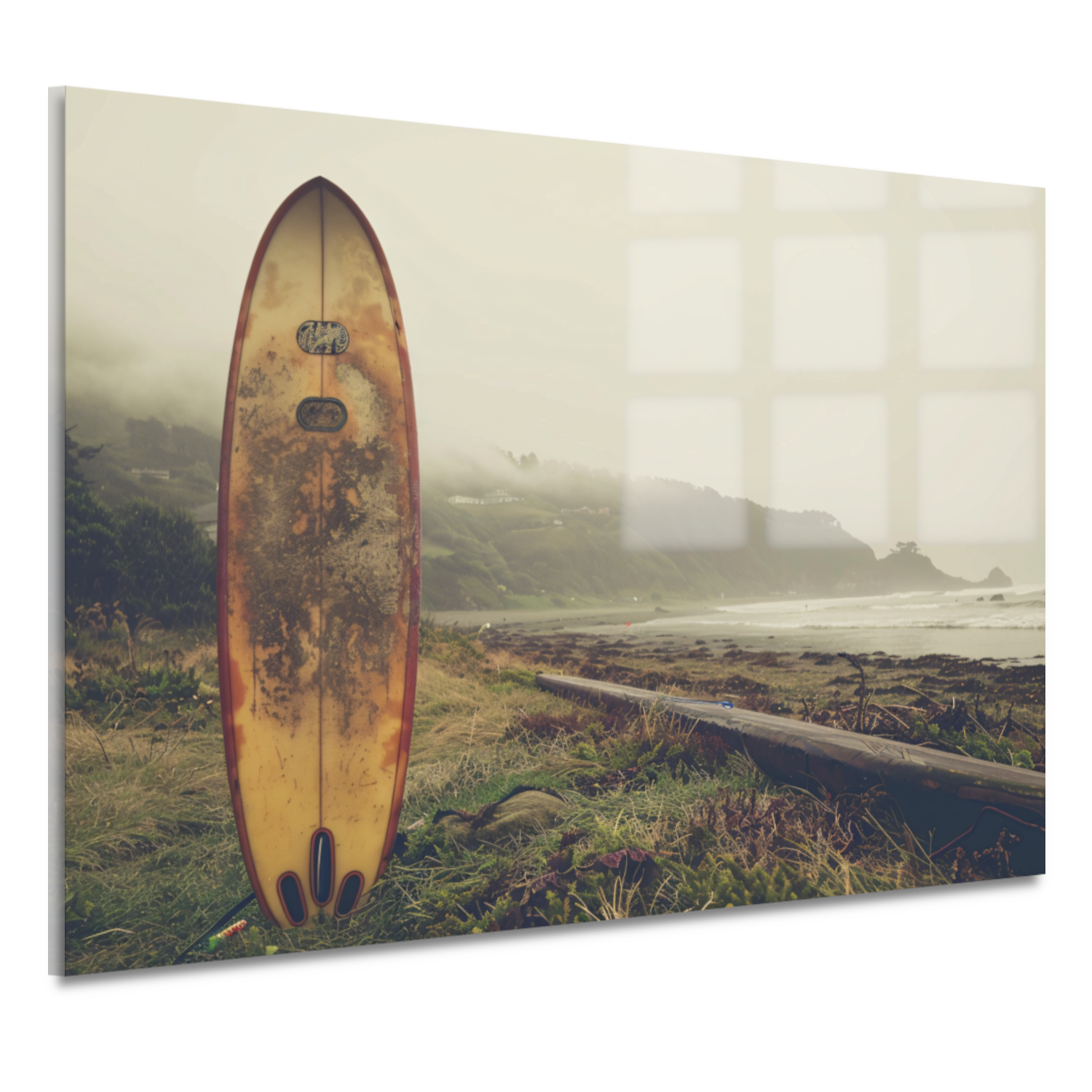 Breng de schoonheid van de zee en het strand naar binnen met dit unieke Verweerde Surfboard op Mistig Strand acrylglas en creëer een ontspannen en inspirerende sfeer in jouw huis. Perfect voor liefhebbers van de kust en surfers!