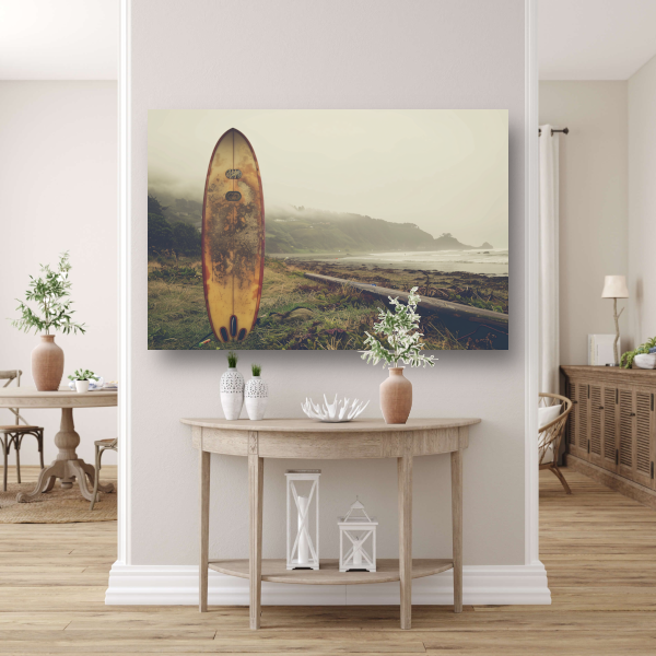 Dankzij de heldere kleuren en scherpe details komt dit ontwerp echt tot leven en voegt het een unieke sfeer toe aan elke kamer. De afbeelding van het verweerde surfboard op een mistig strand zorgt voor een rustgevende en tegelijkertijd avontuurlijke uitstraling.