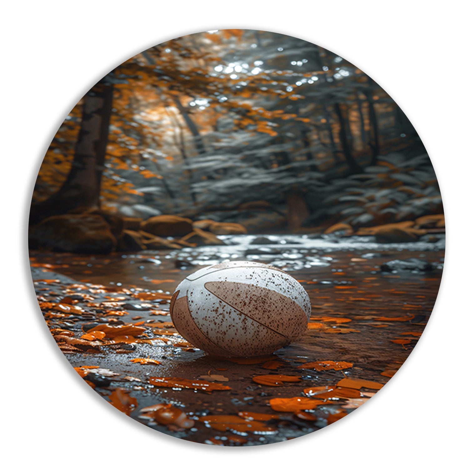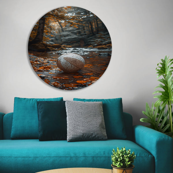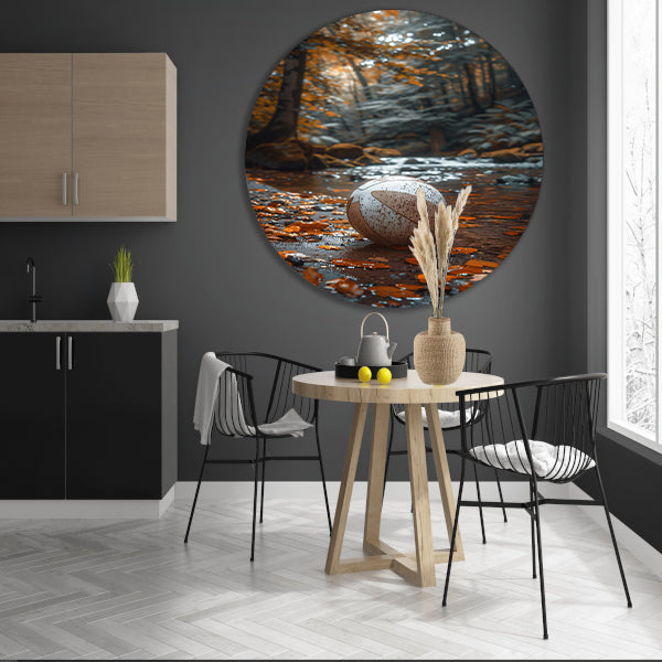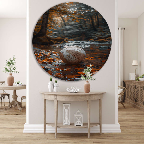 De verweerde bal in het herfstbos is een tijdloos en sfeervol beeld dat past in elk interieur. De muurcirkel is verkrijgbaar in diverse maten, zodat je altijd een formaat kunt kiezen dat perfect past bij jouw wand.