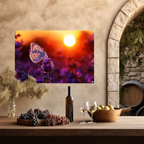 Vlinder rust op lavendel in oranje zonsondergang tuinposter