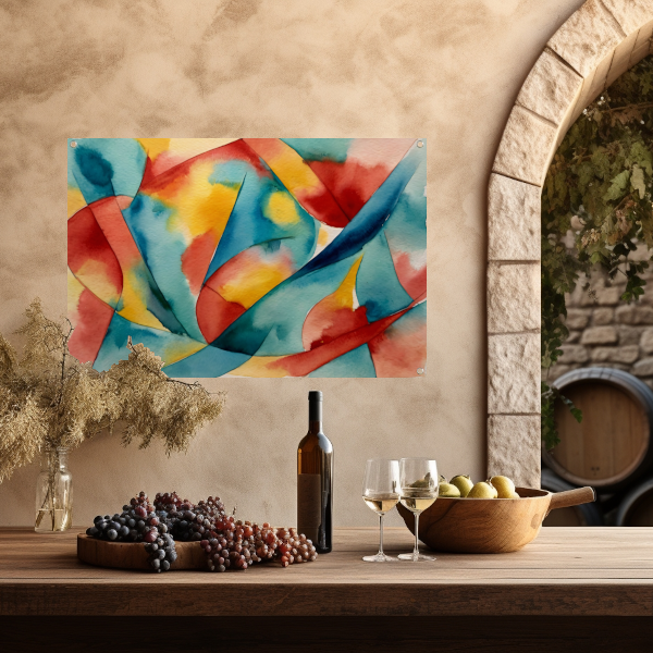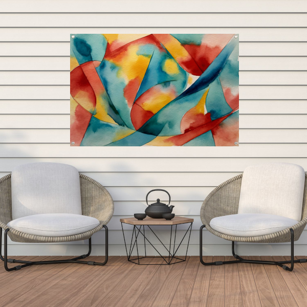 Het thema van deze tuinposter is abstractie, wat betekent dat de afbeelding niet realistisch is, maar juist speels en creatief. De kleuren die gebruikt zijn, zijn levendig en zorgen voor een vrolijke en energieke uitstraling. De waterverf techniek geeft de poster een zachte en natuurlijke look.