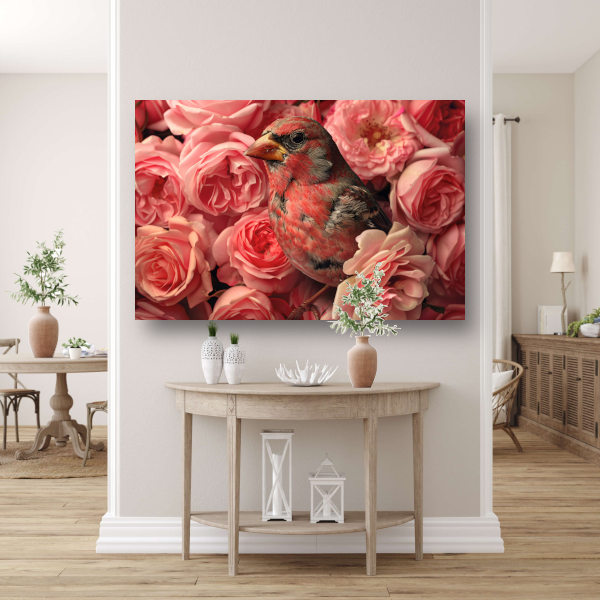 Vogel omhuld door roze rozenpracht acrylglas