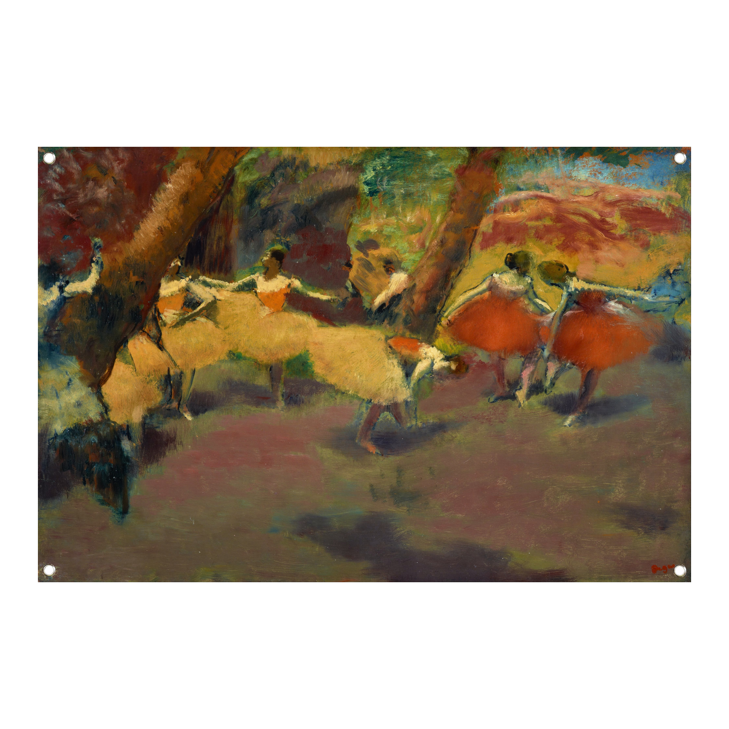 Het thema van deze tuinposter is geïnspireerd op het werk van de beroemde Franse impressionistische kunstenaar, Edgar Degas. Het toont een groep ballerina's die zich voorbereiden op een voorstelling, omringd door een weelderige tuin. De kleuren zijn zacht en subtiel, met een mix van pasteltinten en aardetinten die een rustgevende sfeer creëren.