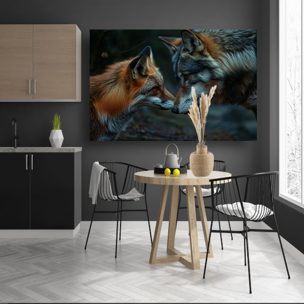 Vos en wolf neus aan neus schilderij canvas met baklijst