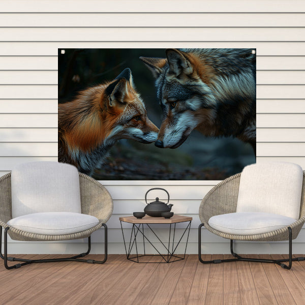 Vos en wolf neus aan neus schilderij tuinposter
