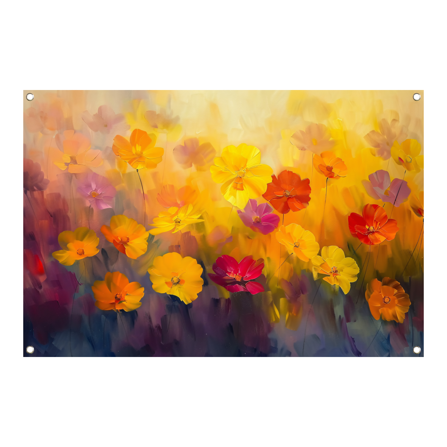 Vrolijk bloemenveld met felle kleuren tuinposter