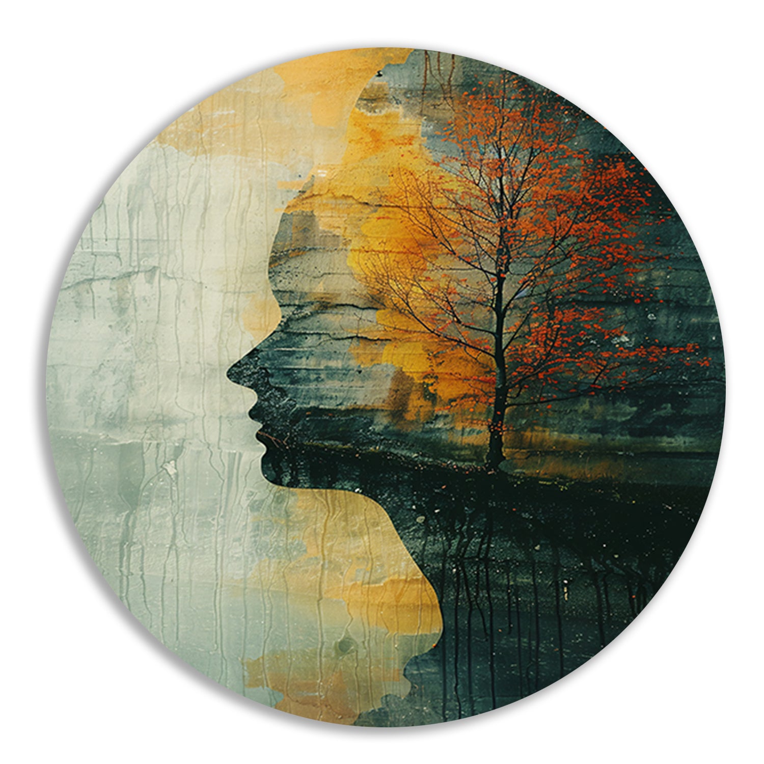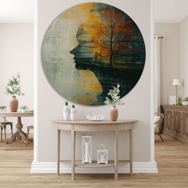 Vrouw met boom in herfstkleuren aluminium muurcirkel
