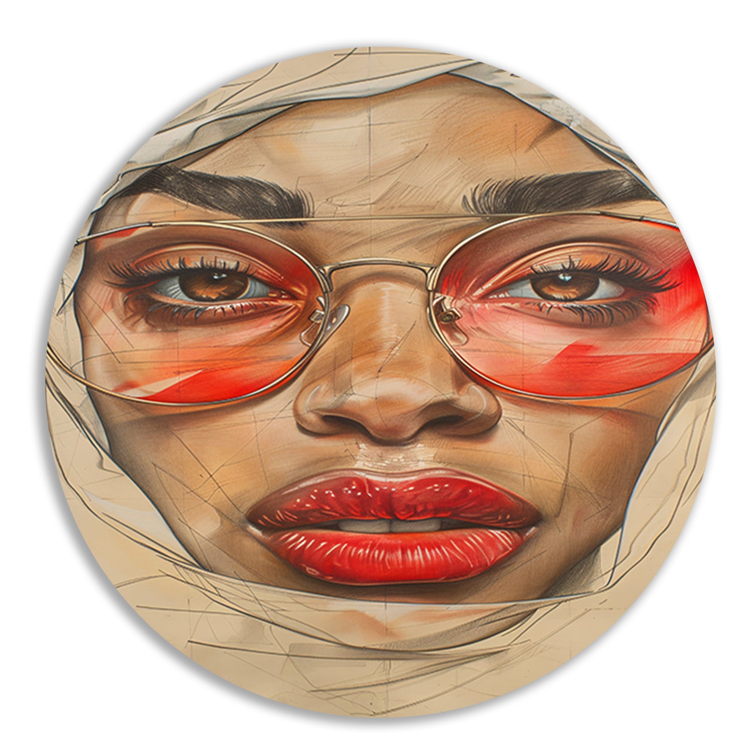 Vrouw met spiegelende rode bril aluminium muurcirkel
