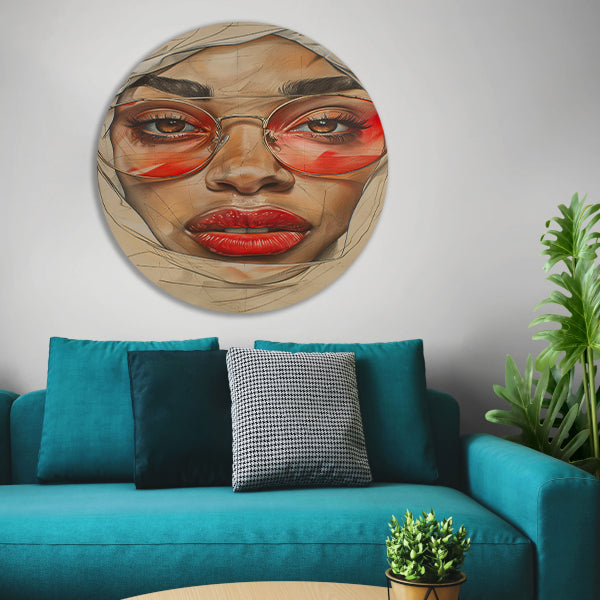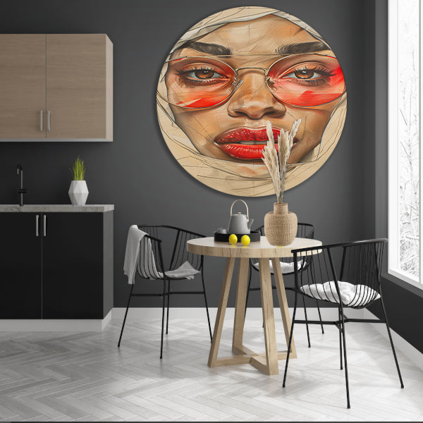 Kortom, deze muurcirkel is een echte eyecatcher die zorgt voor een sfeervolle en trendy uitstraling in elke kamer. Geef je interieur een moderne touch met deze vrouw met spiegelende rode bril aluminium muurcirkel!