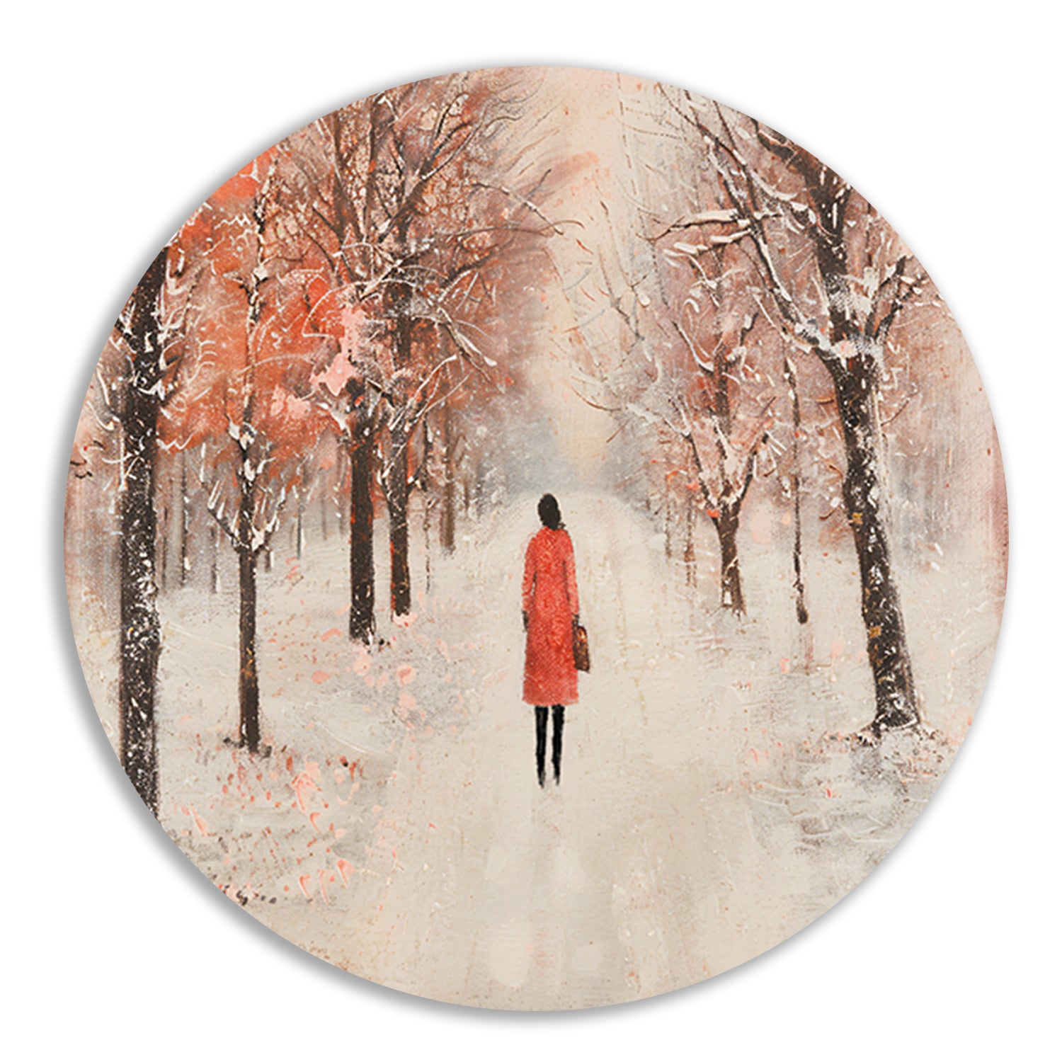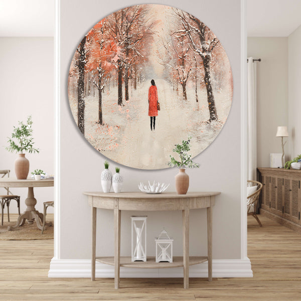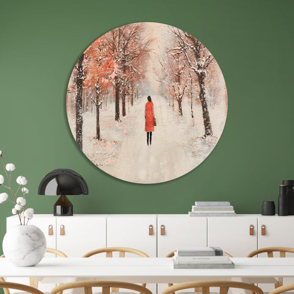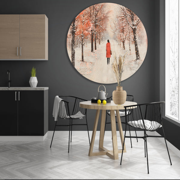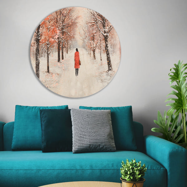 Vrouw wandelt in herfstlandschap met bomen aluminium muurcirkel