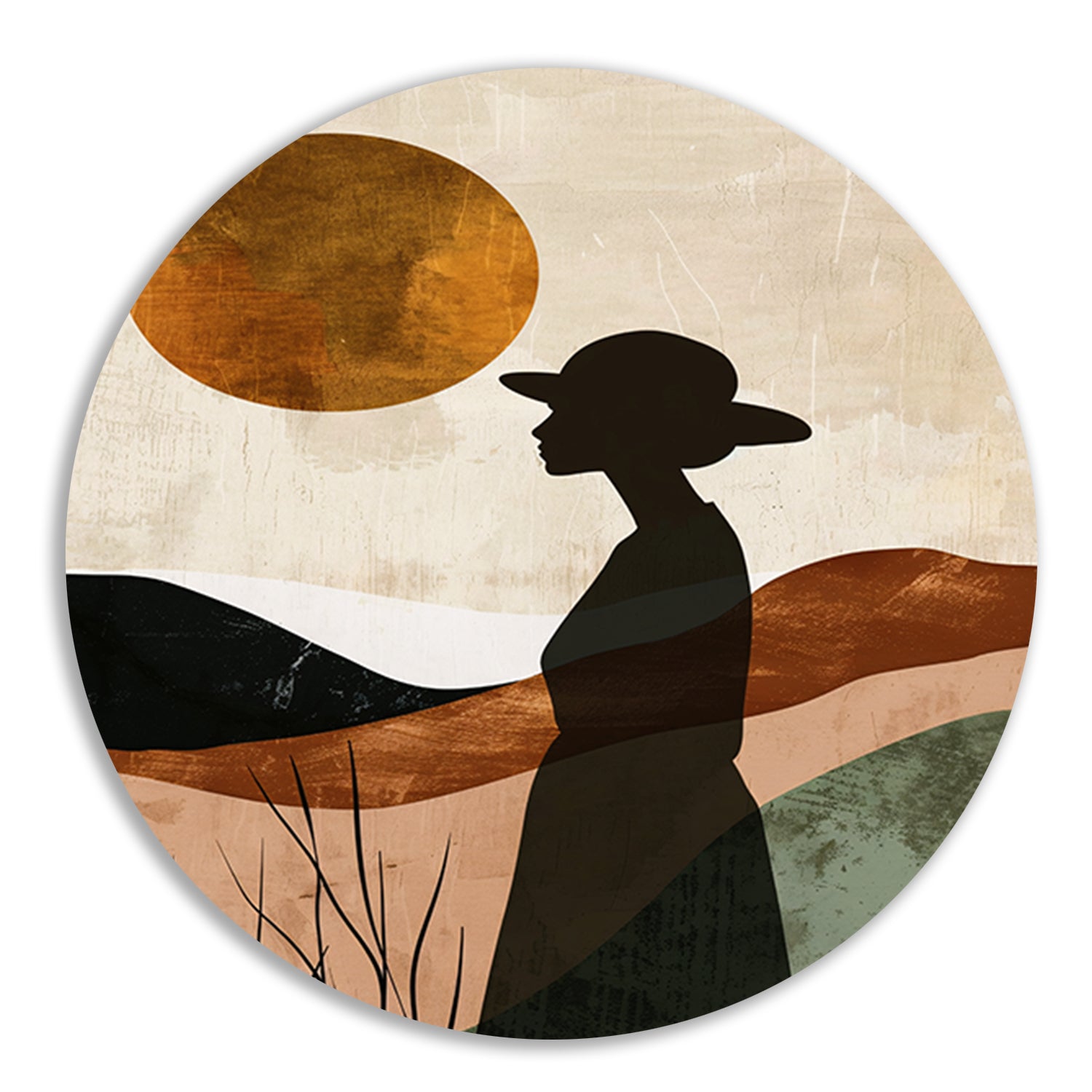 Vrouwelijk silhouet met abstracte natuur en warme kleuren aluminium muurcirkel