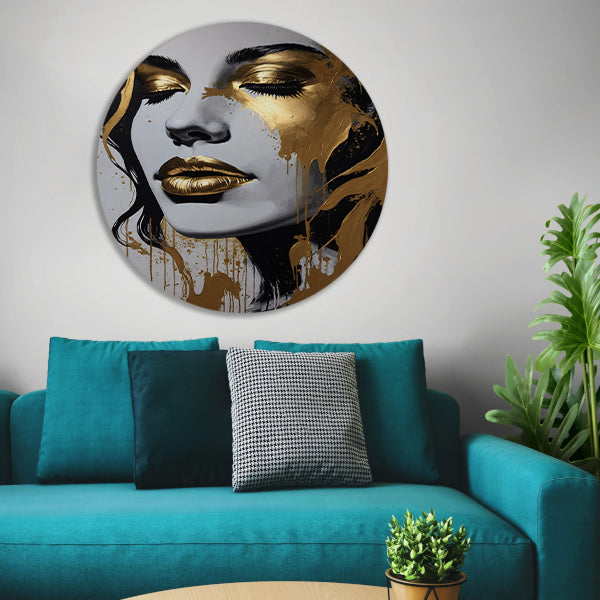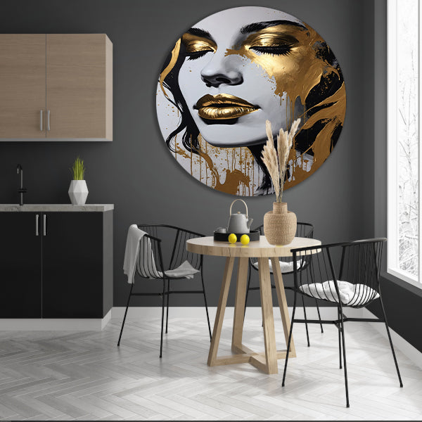 Vrouwengezicht in Zwart, Wit en Goud aluminium muurcirkel
