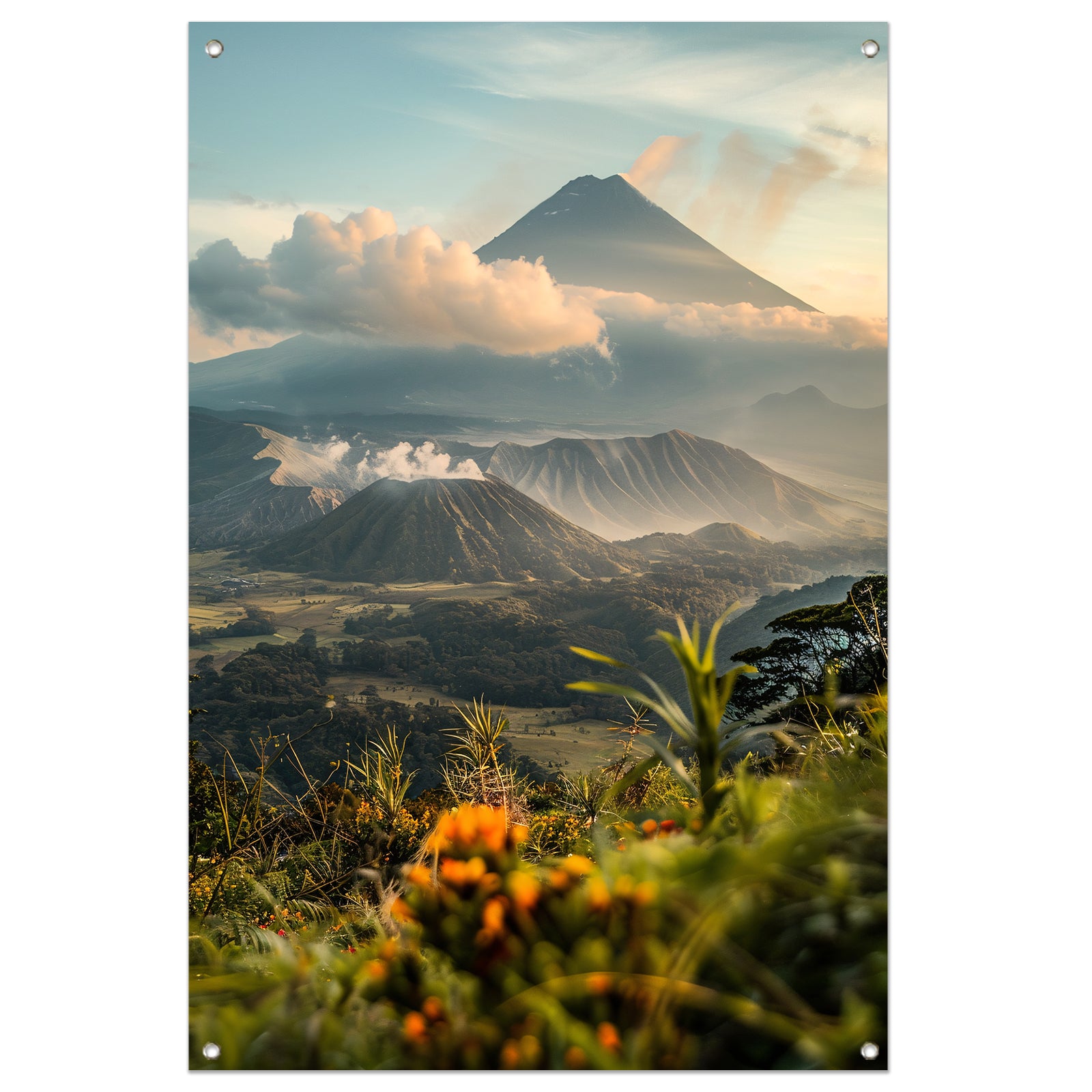 Vulkanisch landschap met bloemen bij zonsopgang tuinposter