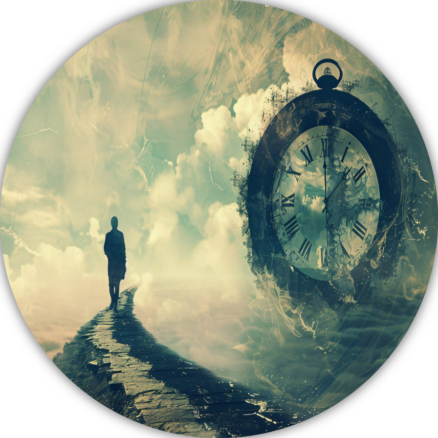 Wandelaar op een surrealistische tijdbrug aluminium muurcirkel