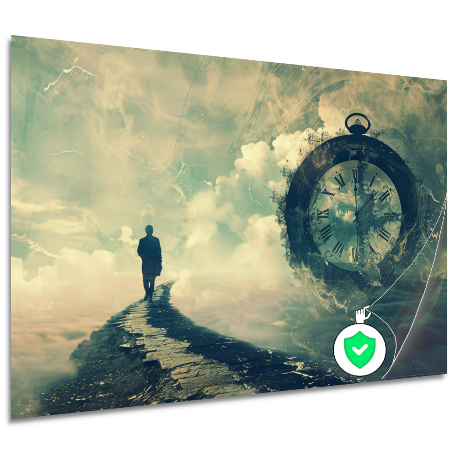 Wandelaar op een surrealistische tijdbrug poster