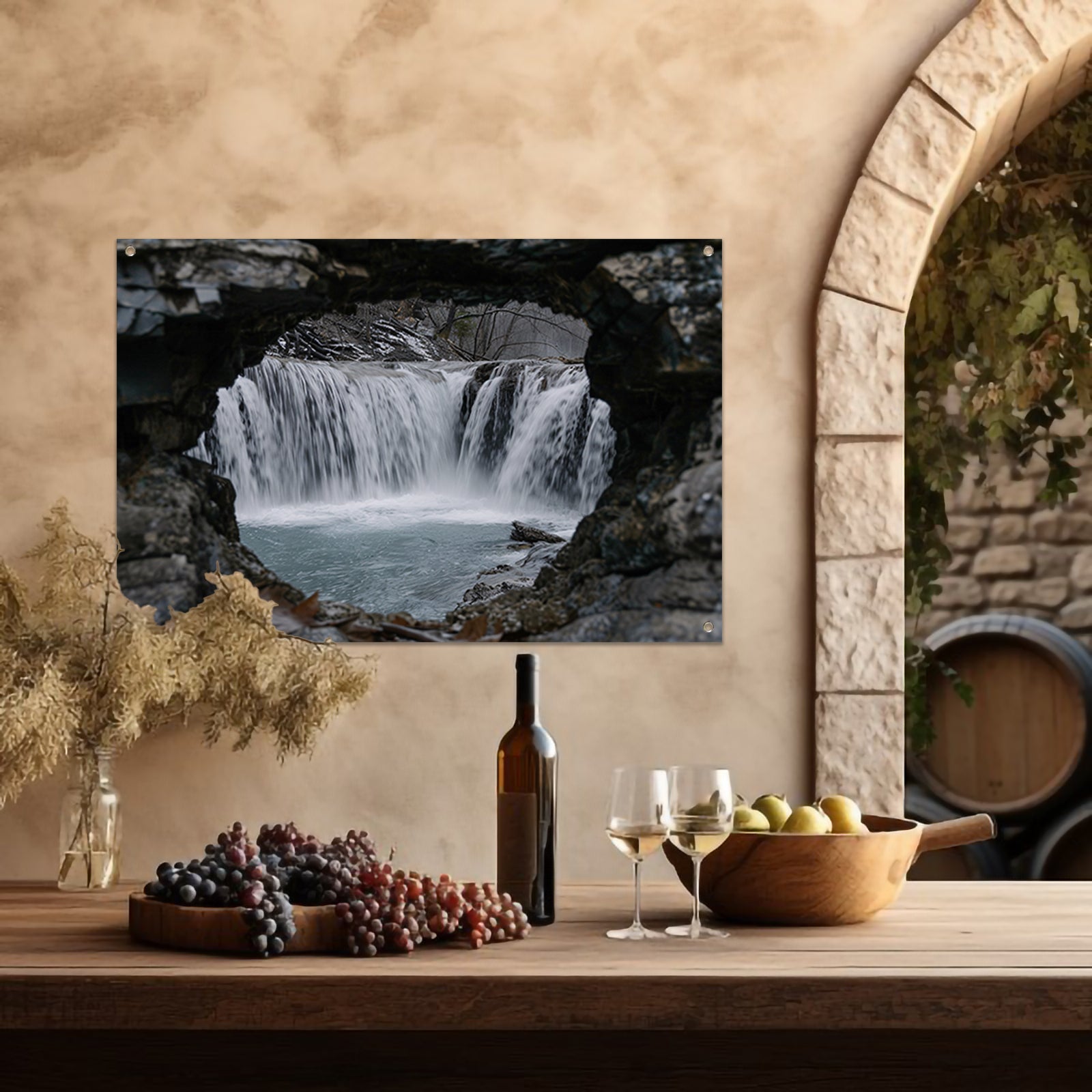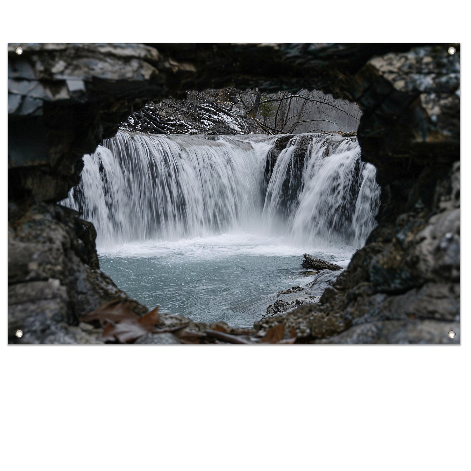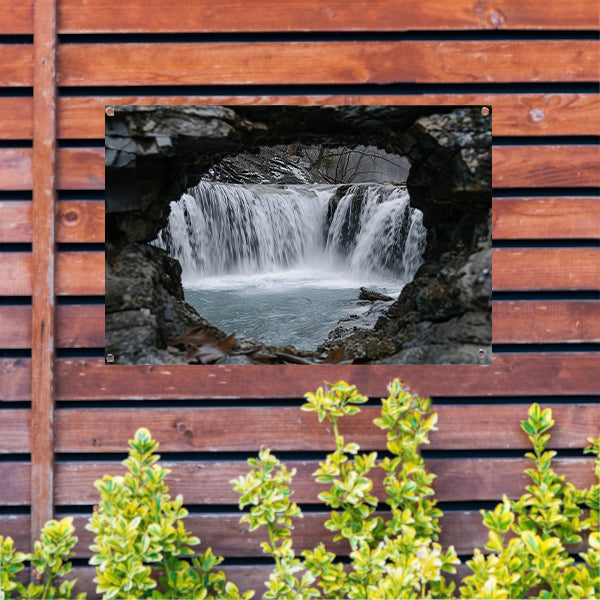Waterval door natuurlijke rotsopening tuinposter