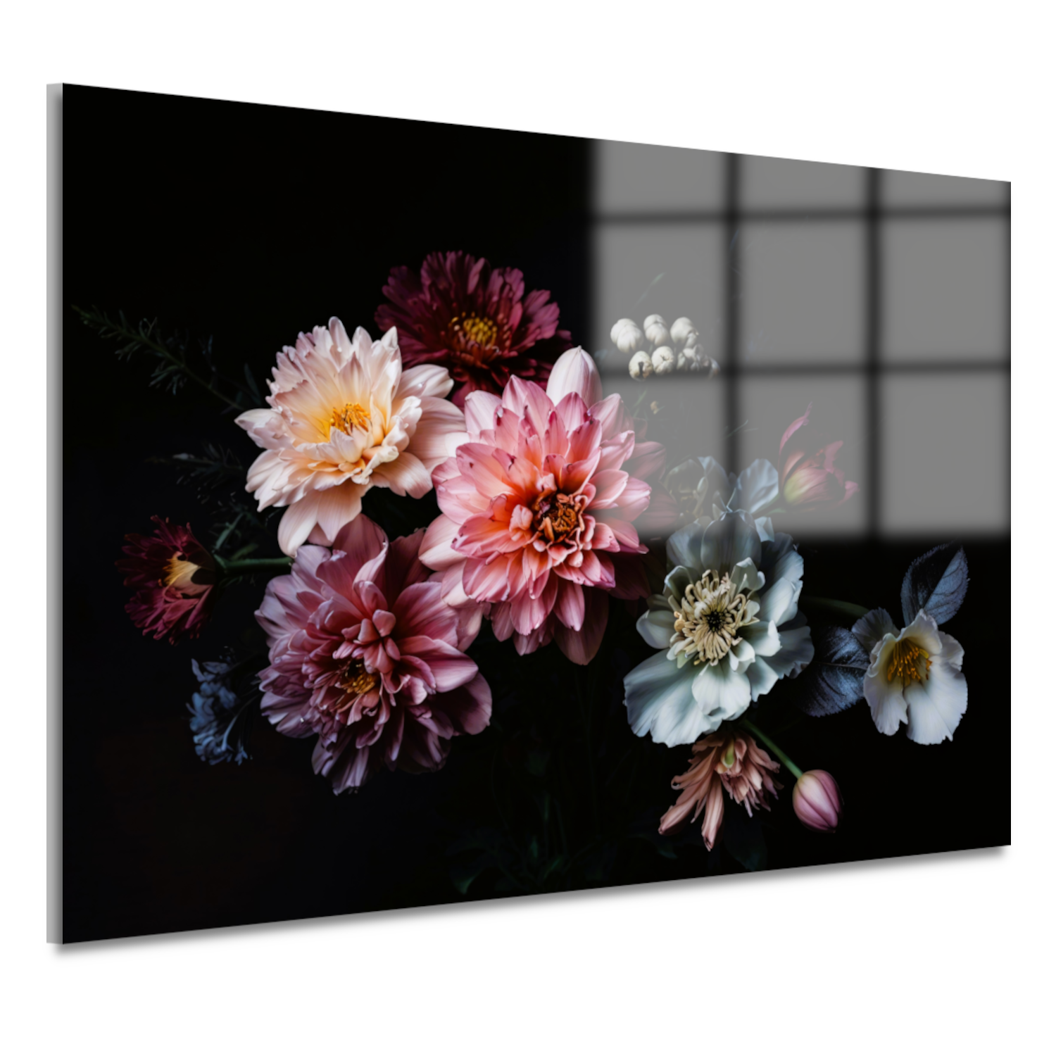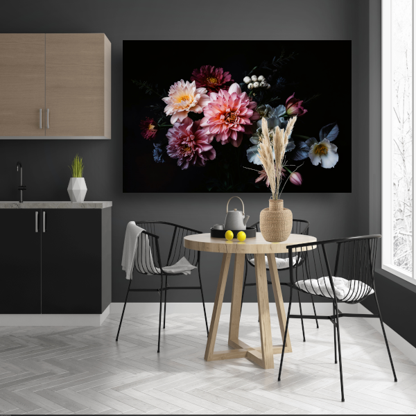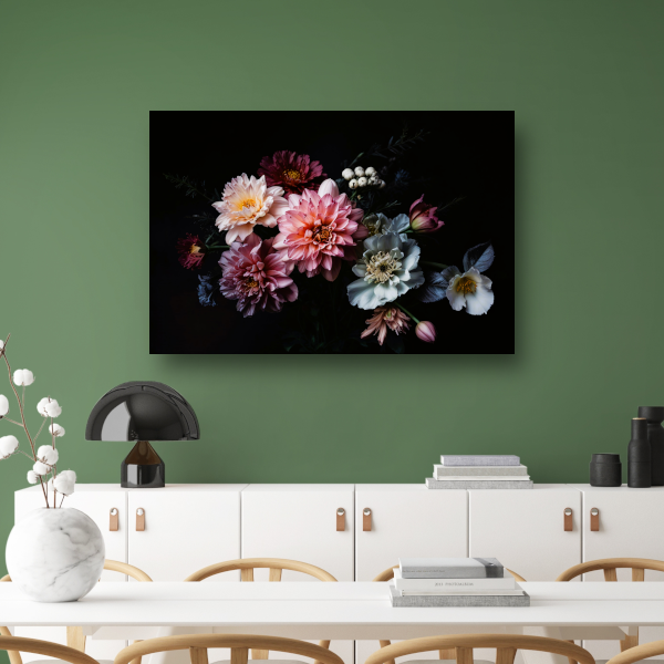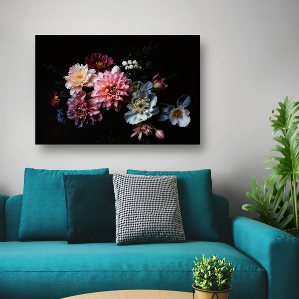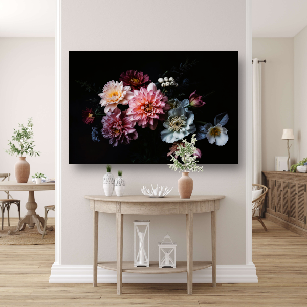 Weelderige bloemenpracht tegen donkere achtergrond acrylglas