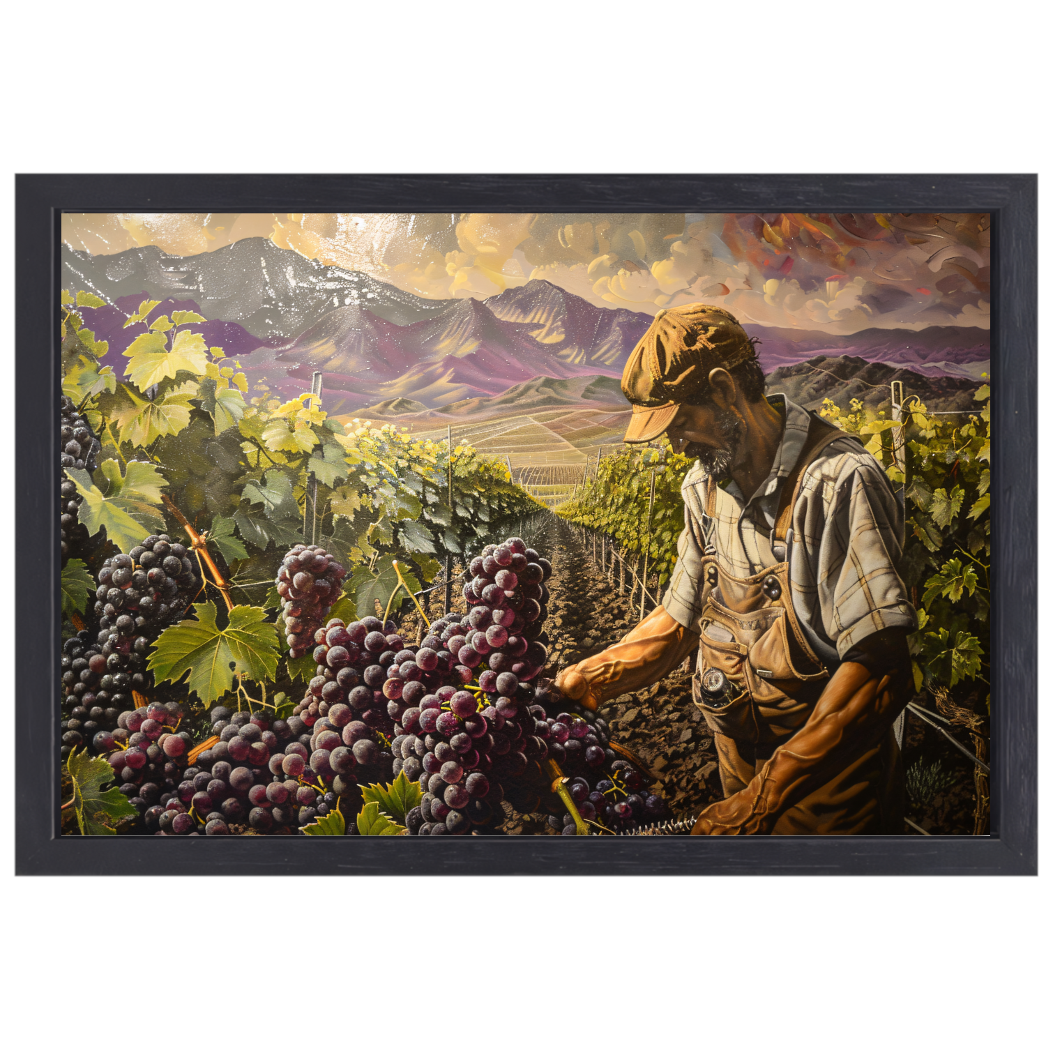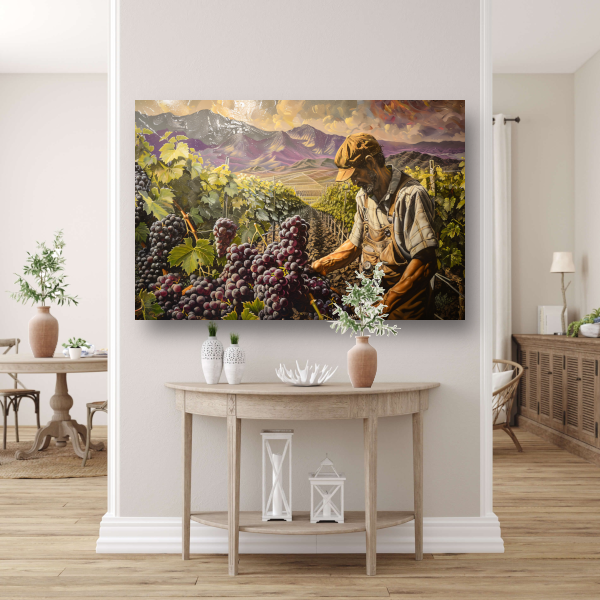 Wijnboer tijdens druivenoogst in vallei canvas met baklijst