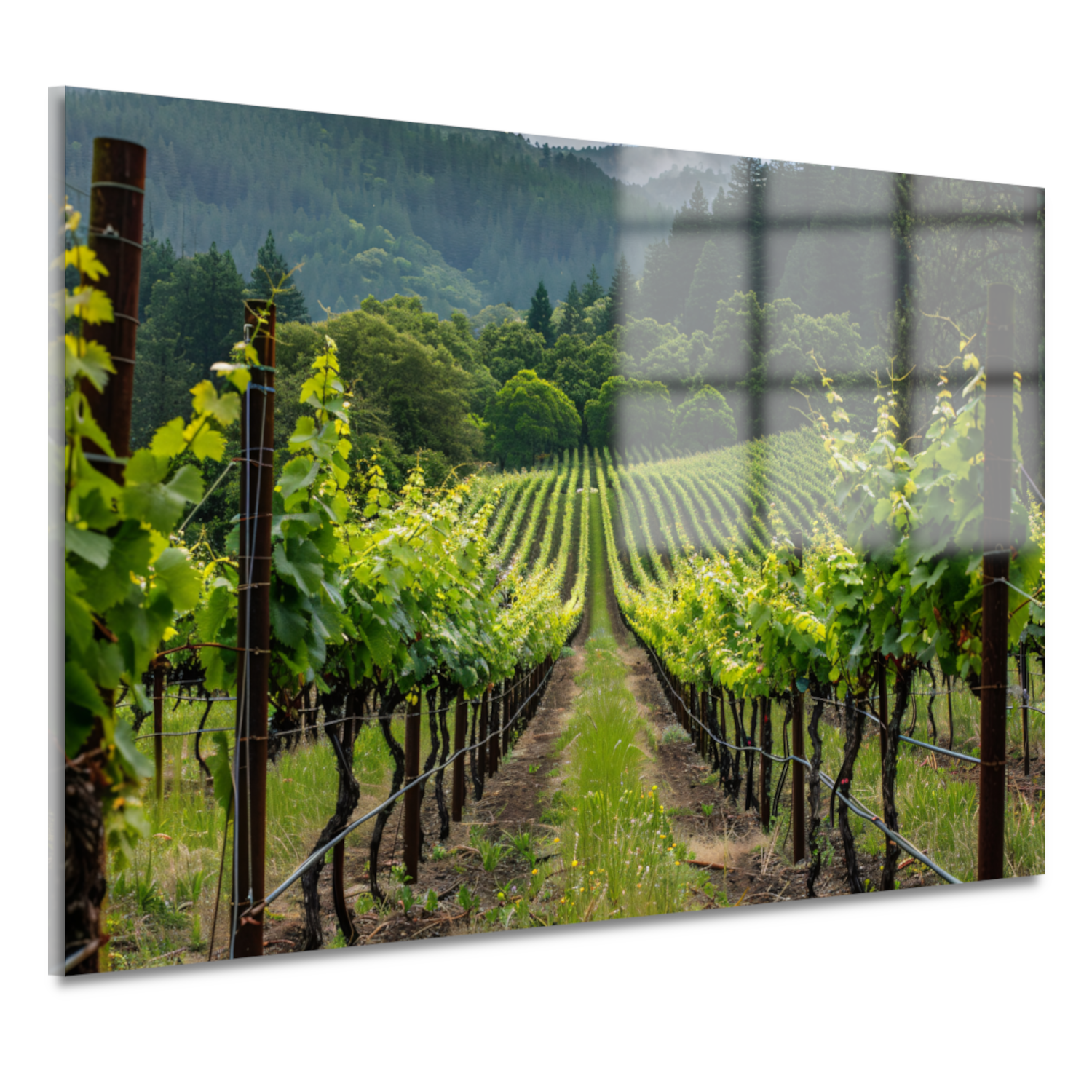 Dit kunstwerk is gedrukt op hoogwaardig 5 mm plexiglas, waardoor de kleuren helder en levendig naar voren komen. De afbeelding toont een serene ochtendsfeer in de vallei, waar de druivenranken bedekt zijn met een lichte nevel. Het subtiele spel van licht en schaduw zorgt voor een rustgevende en sfeervolle uitstraling.