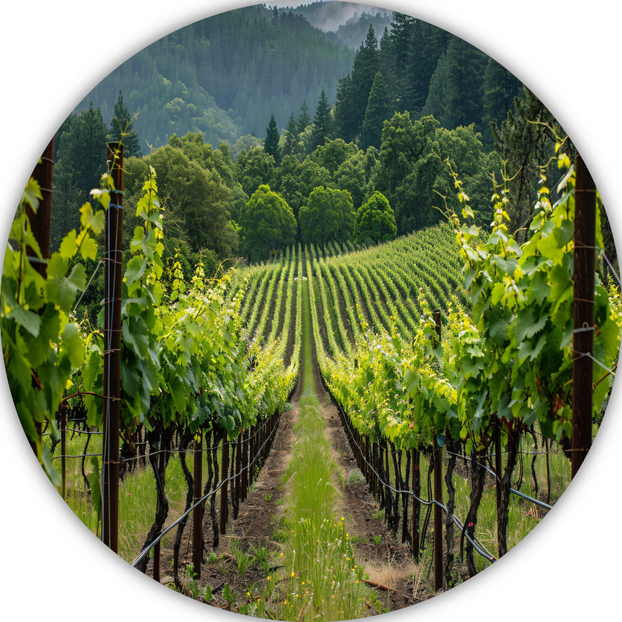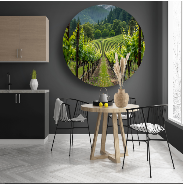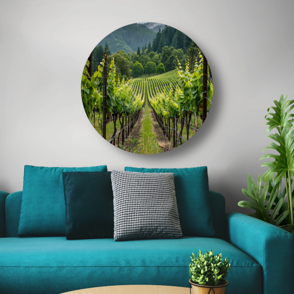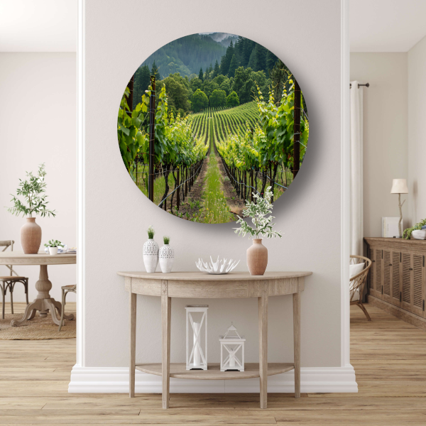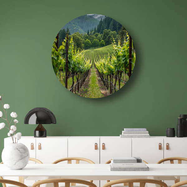 Wijngaard in de vallei met ochtendmist aluminium muurcirkel
