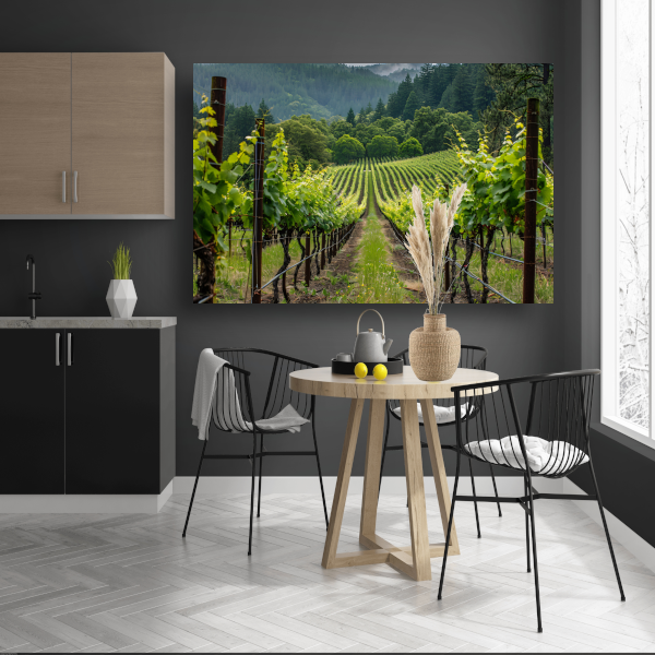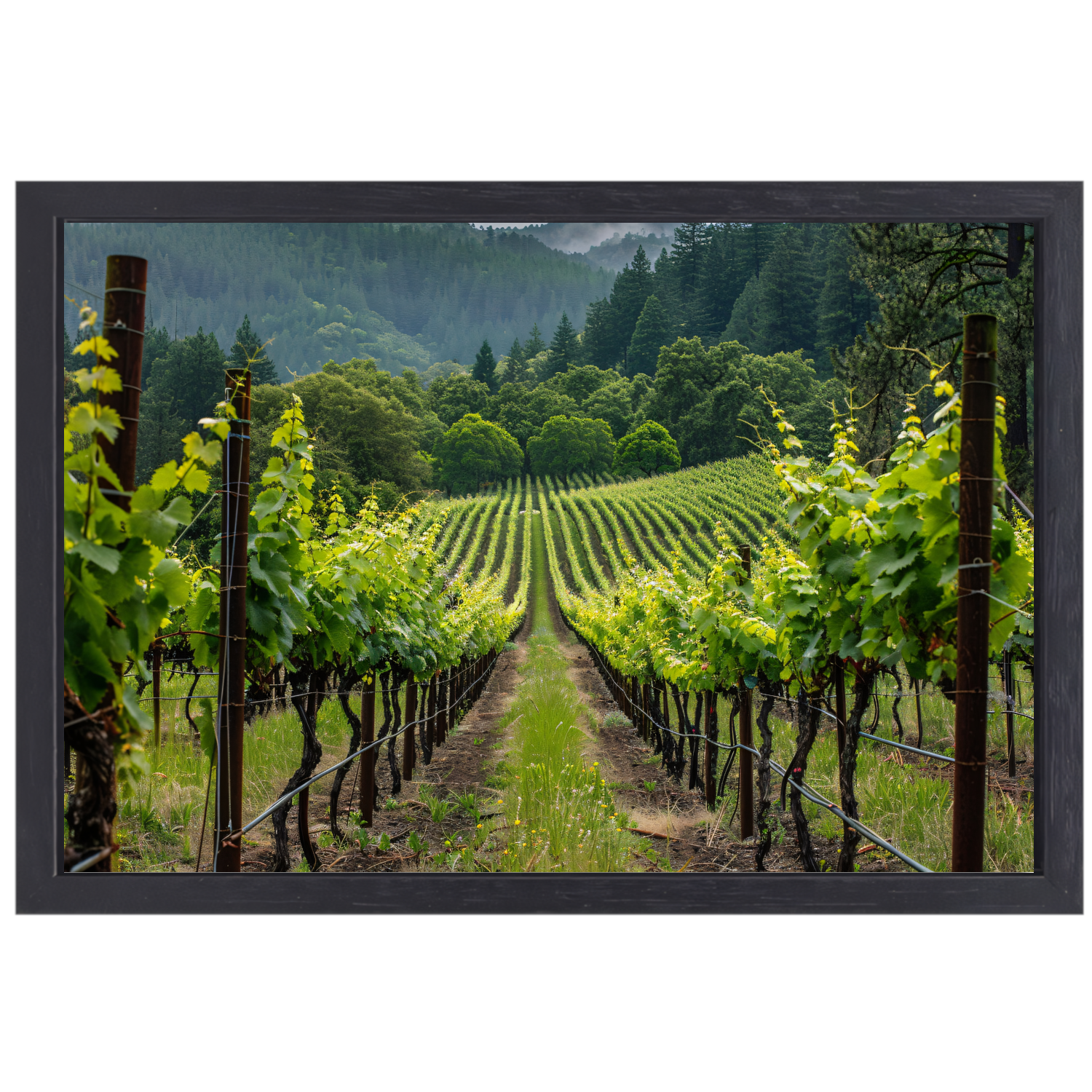 Wijngaard in de vallei met ochtendmist canvas met baklijst