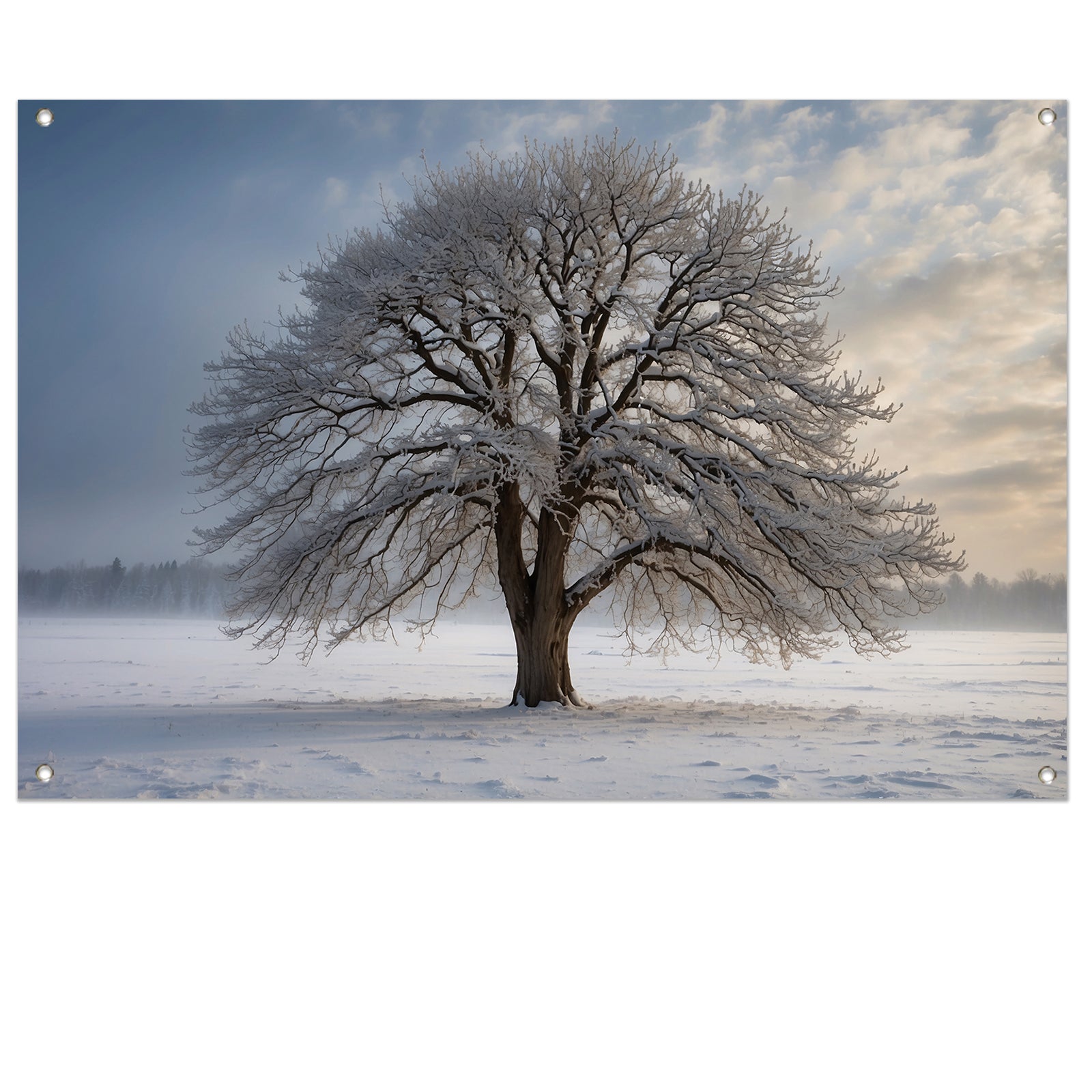 Winterboom in besneeuwd landschap bij zonsondergang tuinposter