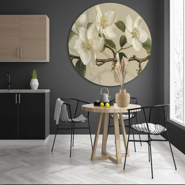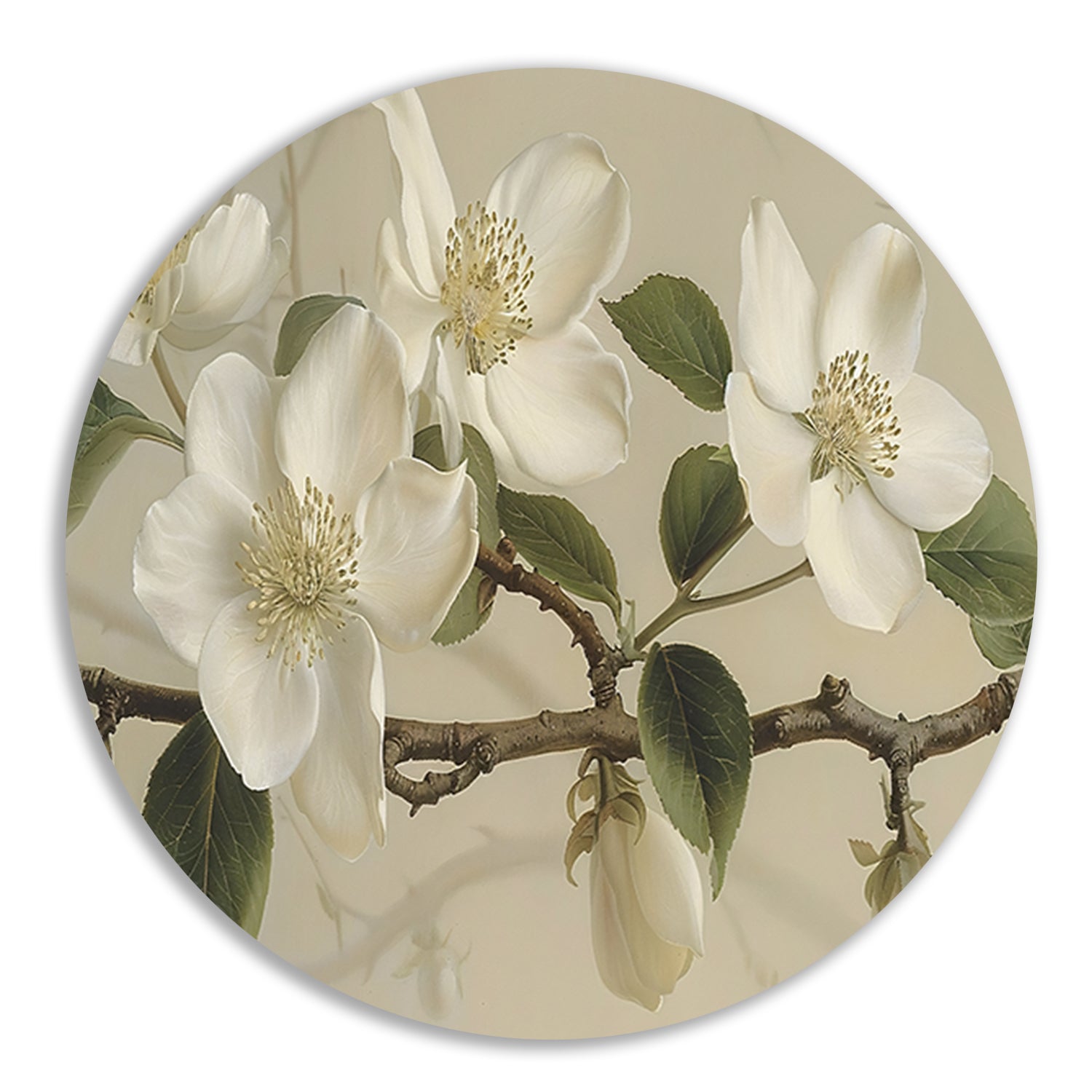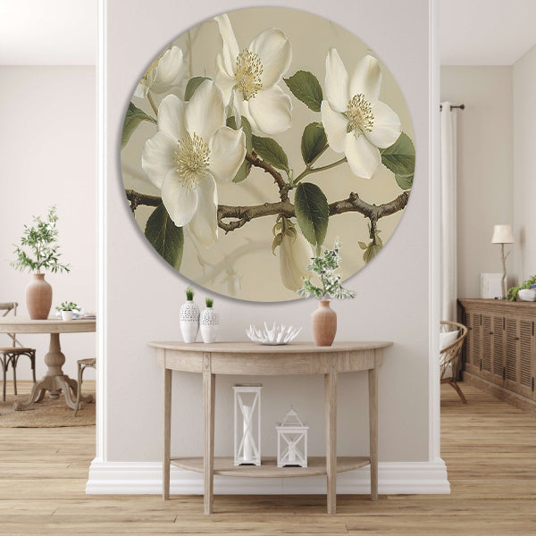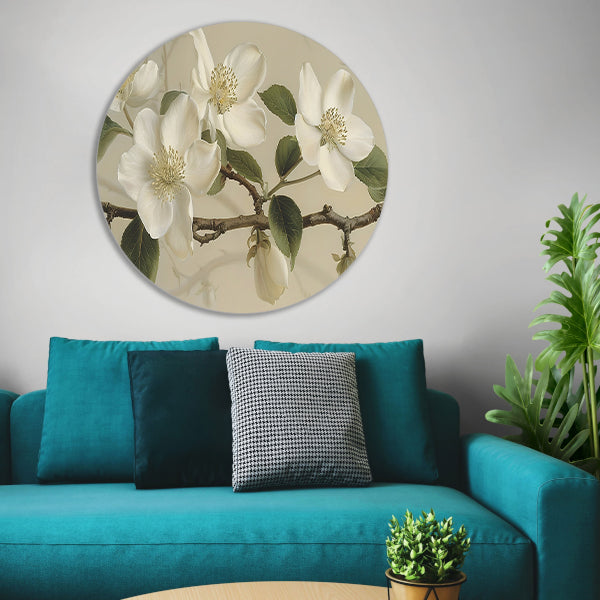 Witte bloemen op tak tegen beige achtergrond forex muurcirkel