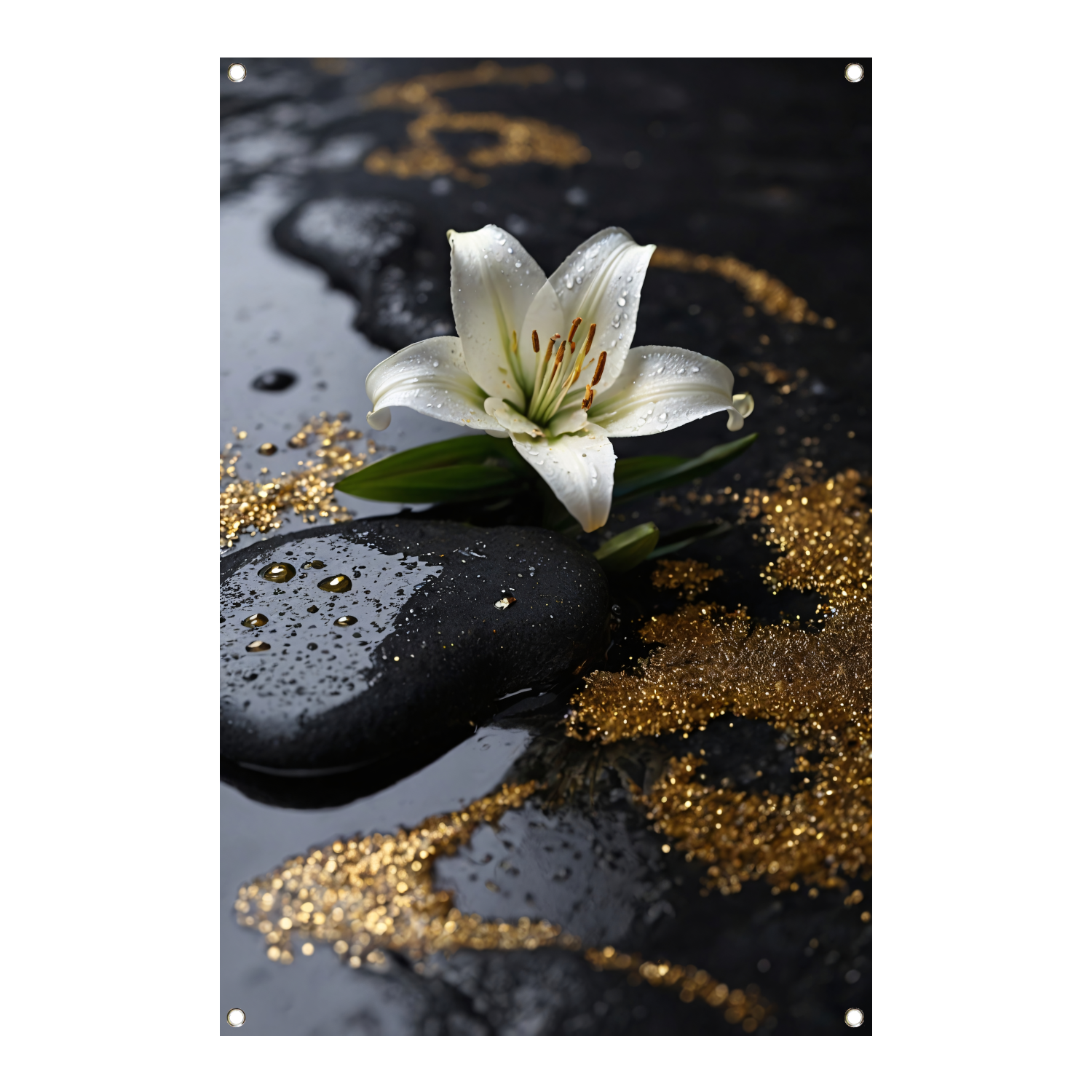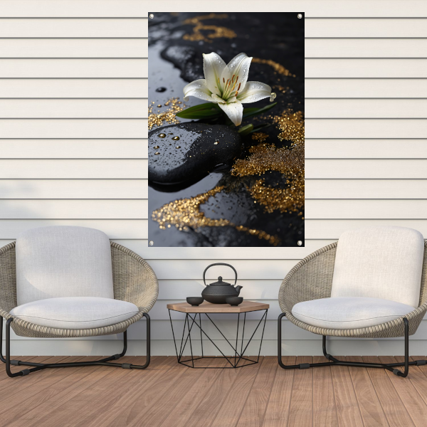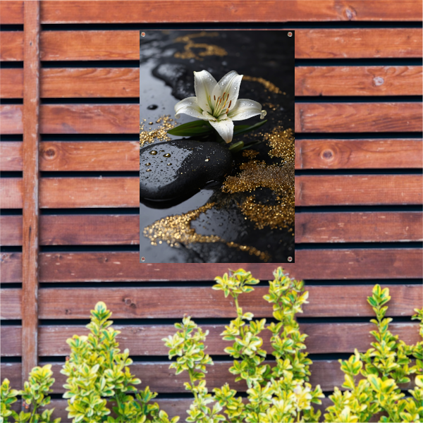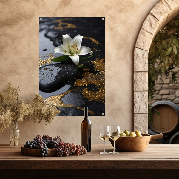 Witte lelie met gouden glans op zwart tuinposter