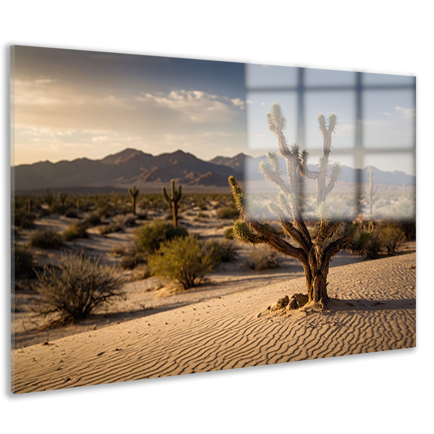 Woestijnlandschap bij zonsondergang met bergen acrylglas