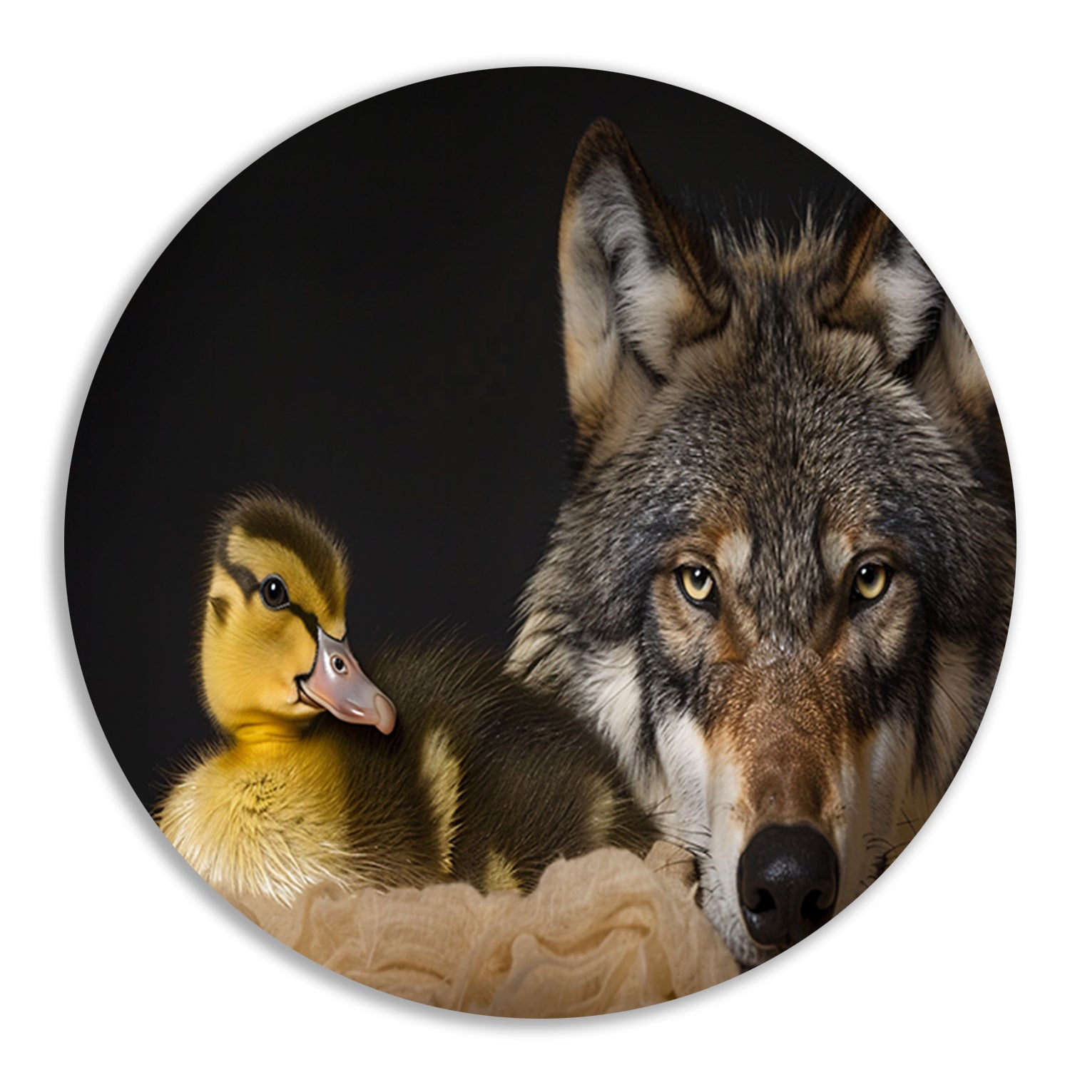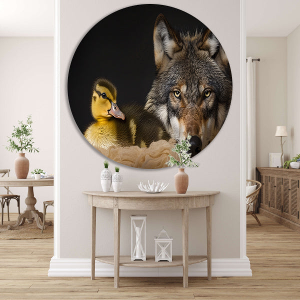 Wolf en eendling: onwaarschijnlijke ontmoeting aluminium muurcirkel