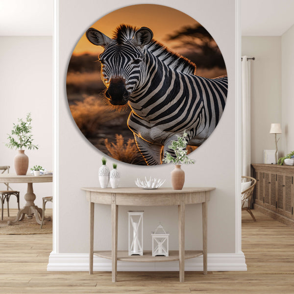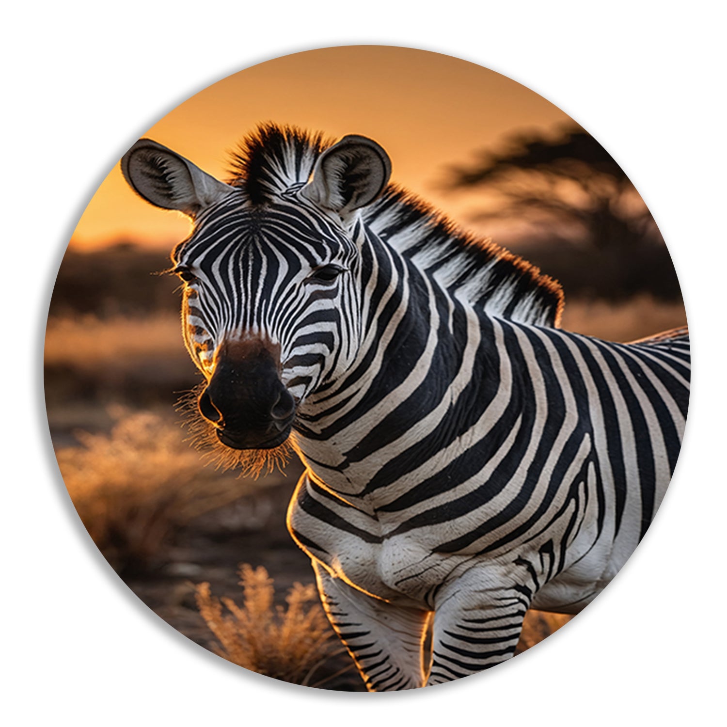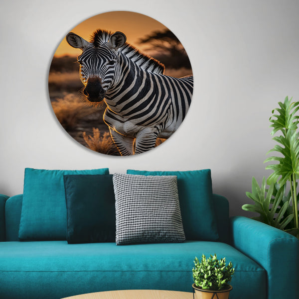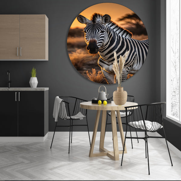 Breng de prachtige zonsondergang en de majestueuze zebra in huis met deze aluminium muurcirkel en geniet elke dag van een stukje natuurlijke schoonheid aan je muur.