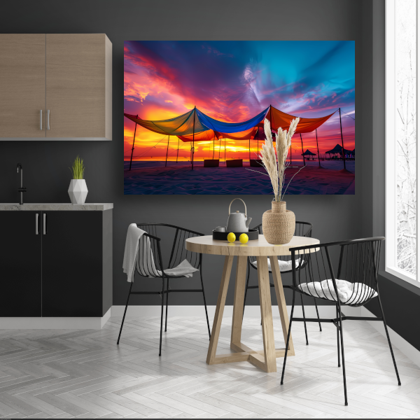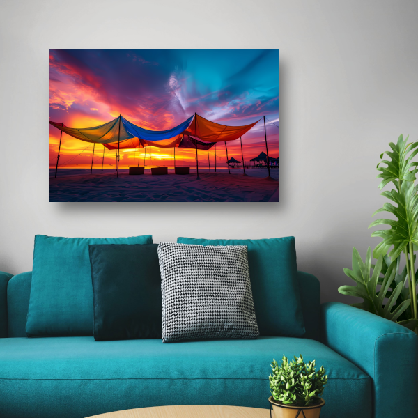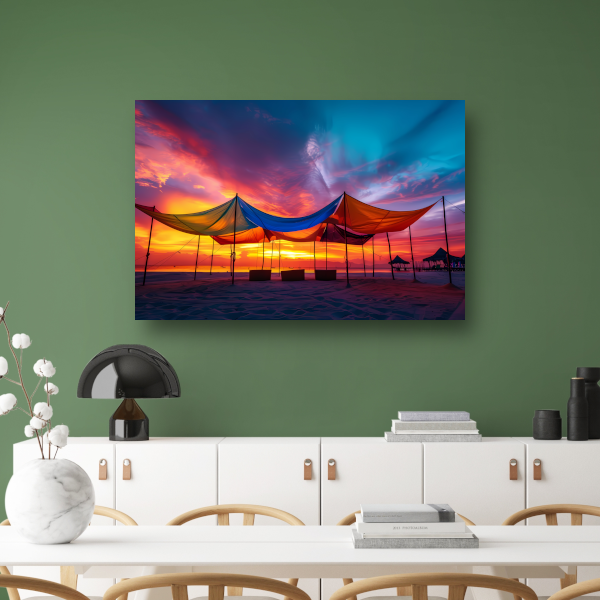 Zomerse tenten op het strand bij zonsondergang acrylglas