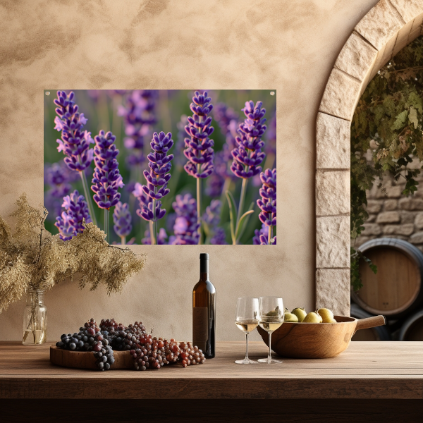 Zonovergoten lavendelveld in bloei tuinposter