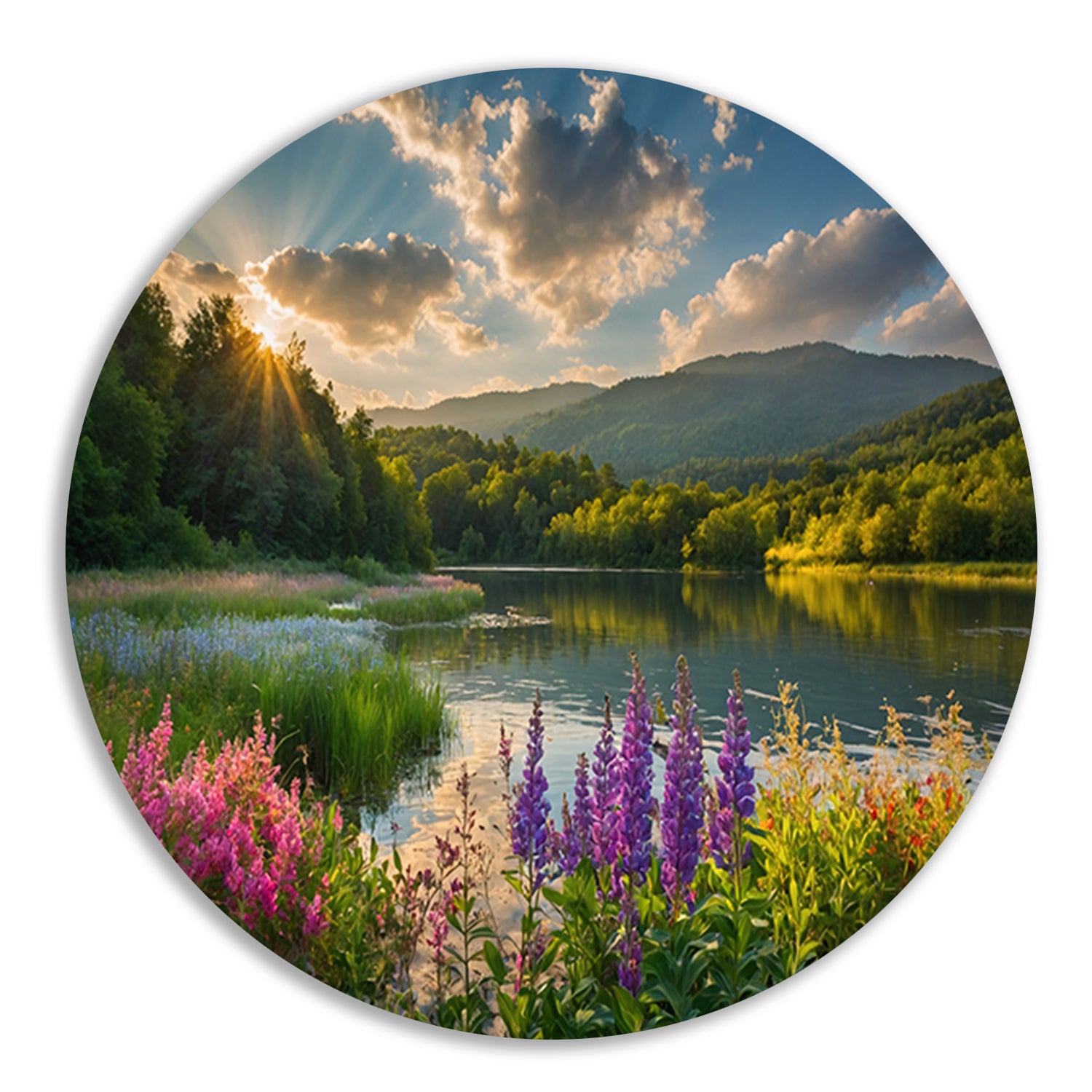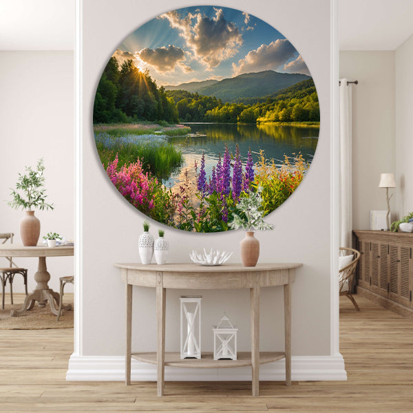 Voeg een vleugje natuurlijke schoonheid toe aan je interieur met deze zonsondergang over bloemenveld en meer aluminium muurcirkel. Het is een unieke en stijlvolle toevoeging aan elke kamer.