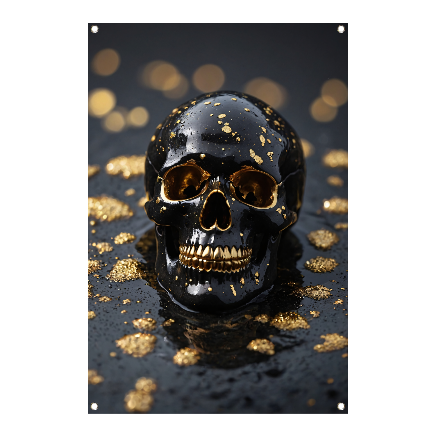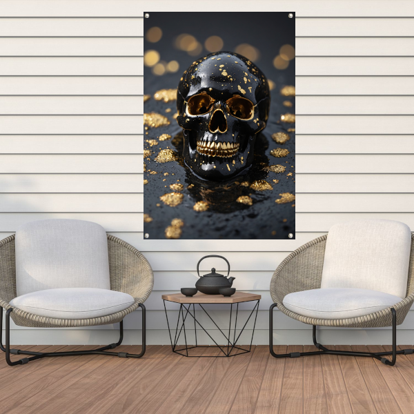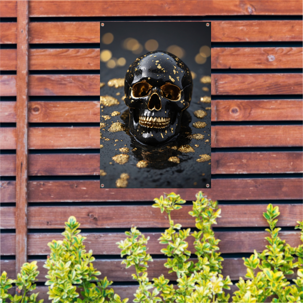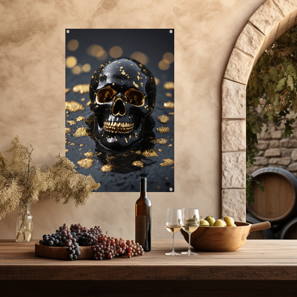 Zwart Gouden Schedel Op Natuursteen tuinposter