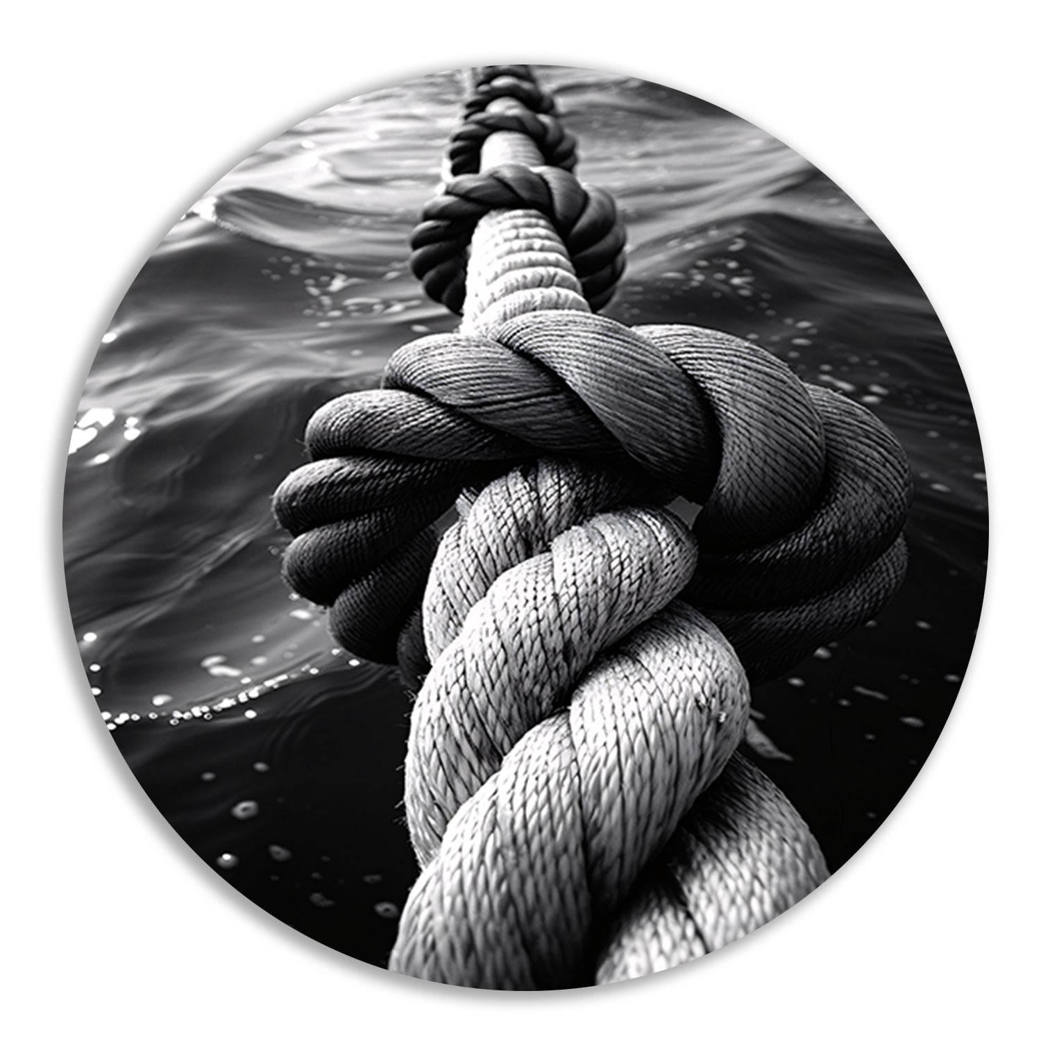 Zwart-wit foto van verweven touw in water aluminium muurcirkel