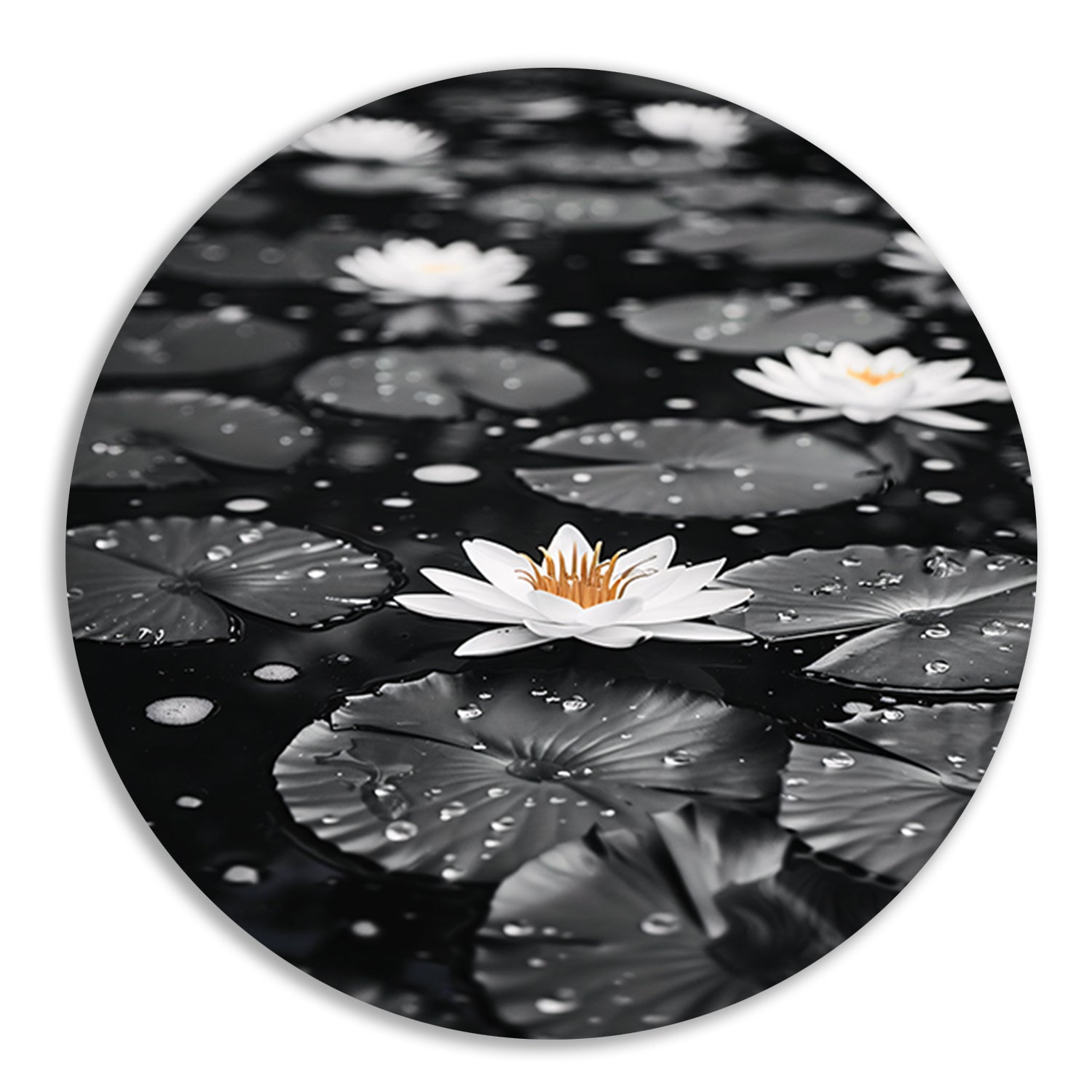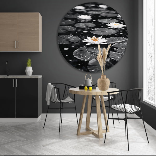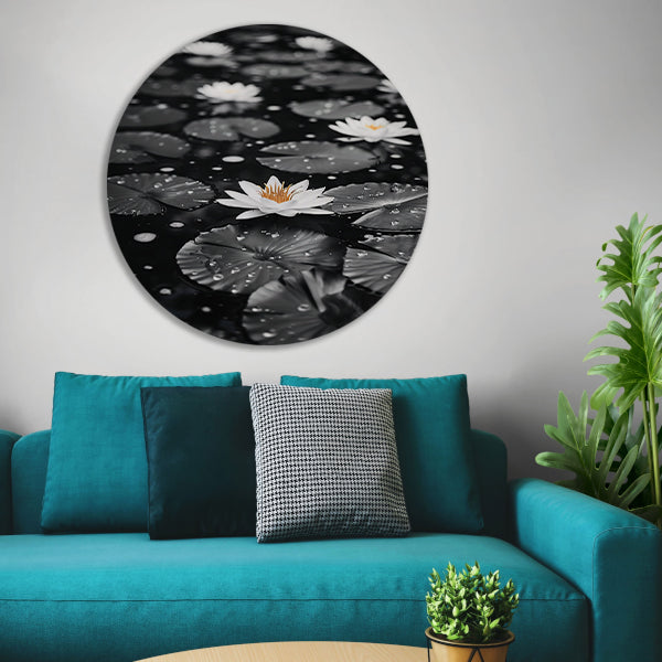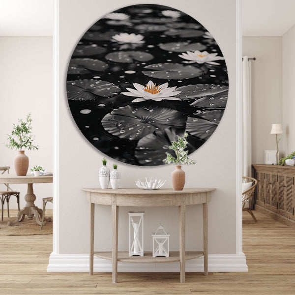 Zwart-wit foto van waterlelies op water forex muurcirkel