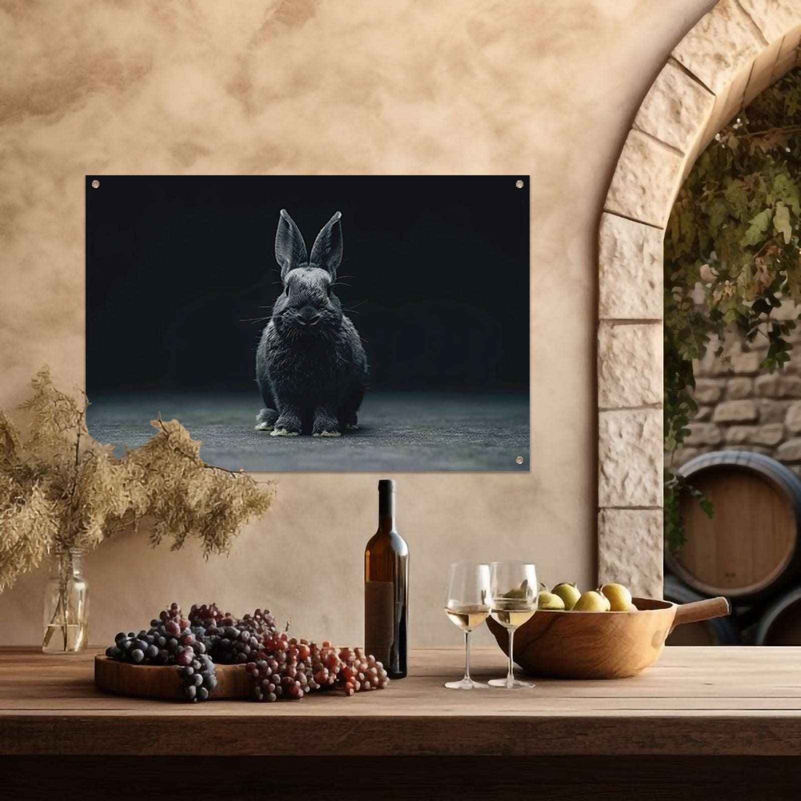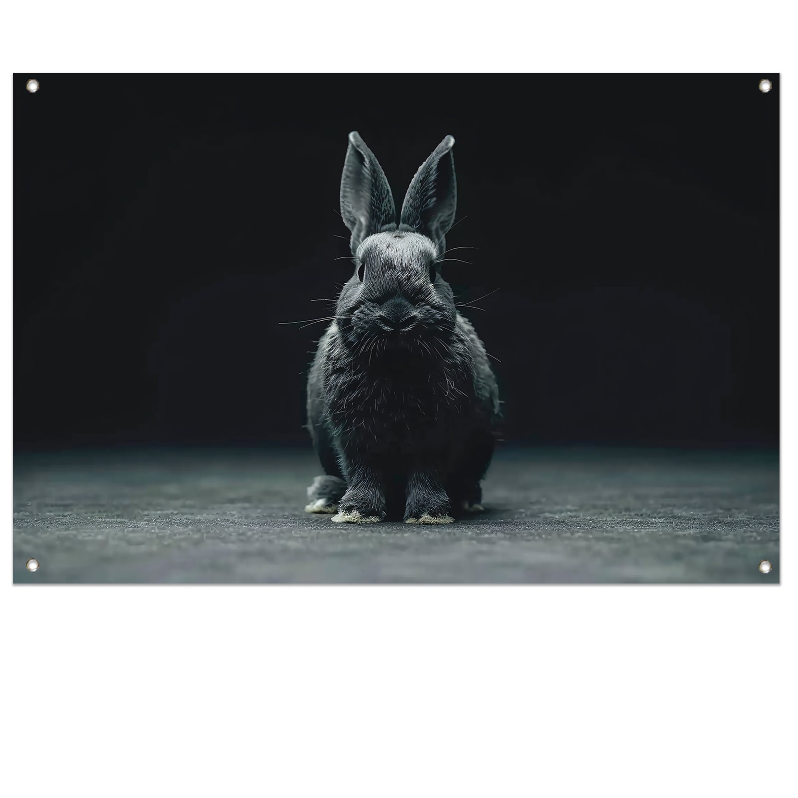 Zwart-wit konijn portret op donkere achtergrond tuinposter