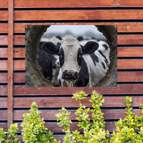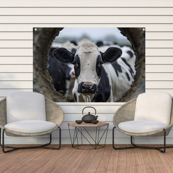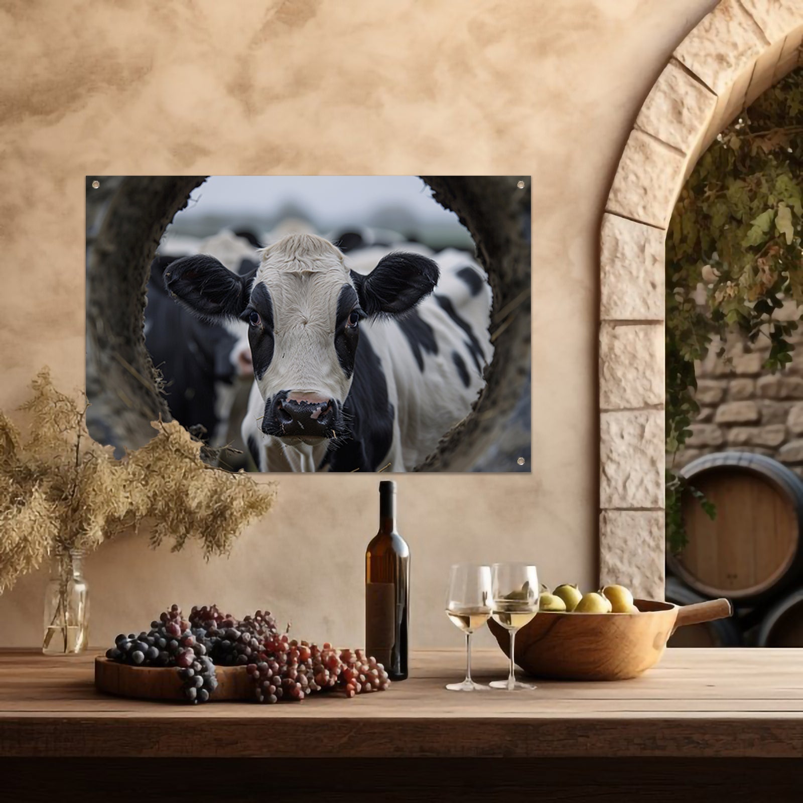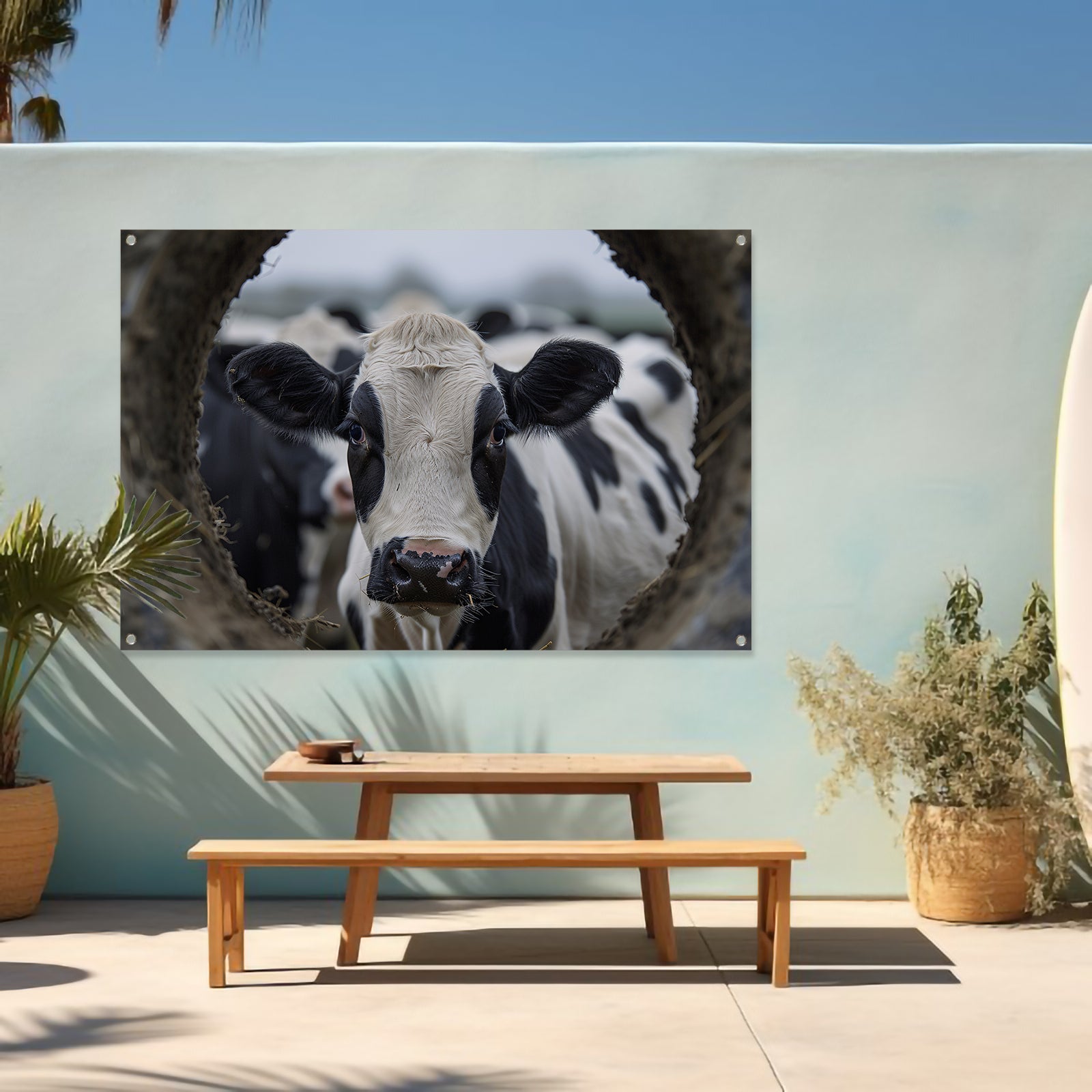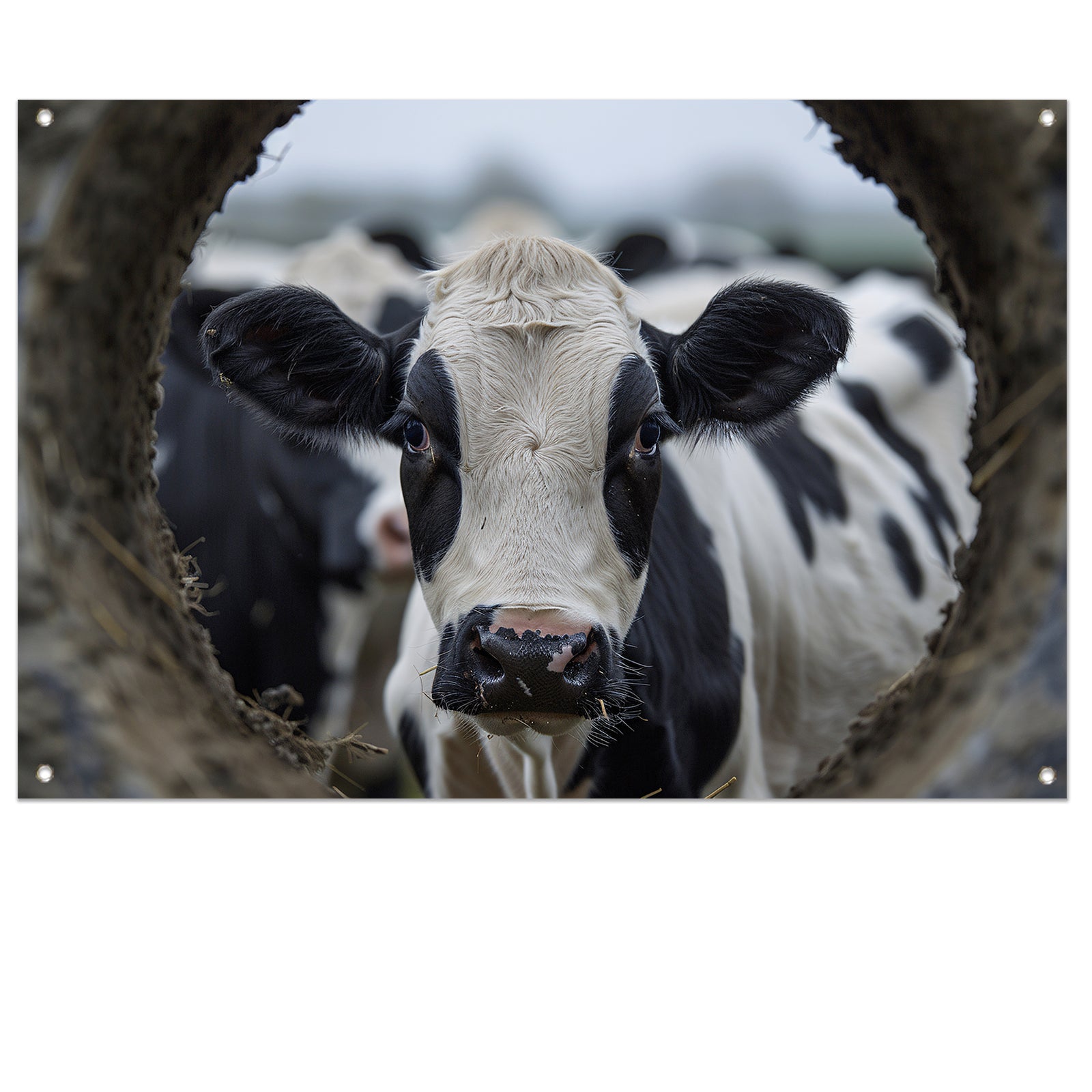 Zwart-wit portret van nieuwsgierige koe in modderige cirkel tuinposter