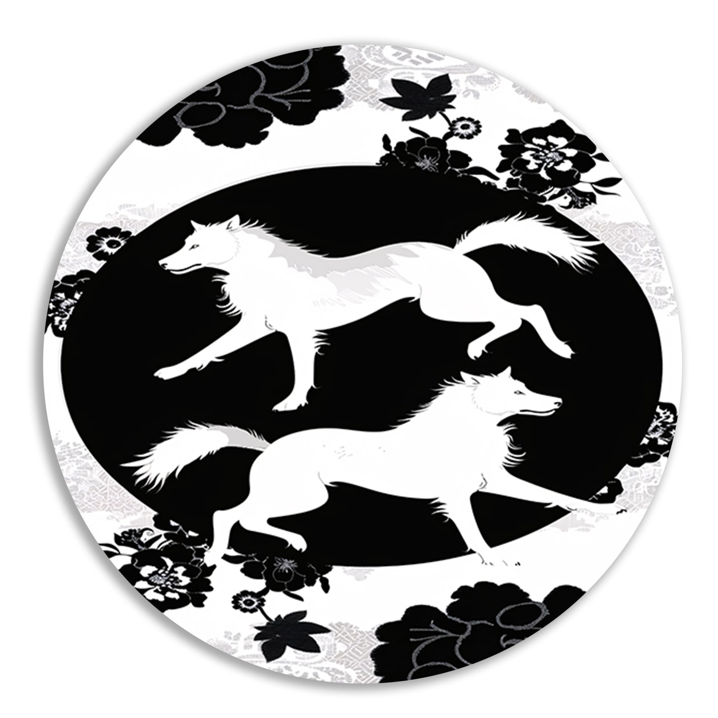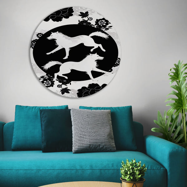 Zwart-wit silhouet van dansende wolven en bloemen forex muurcirkel