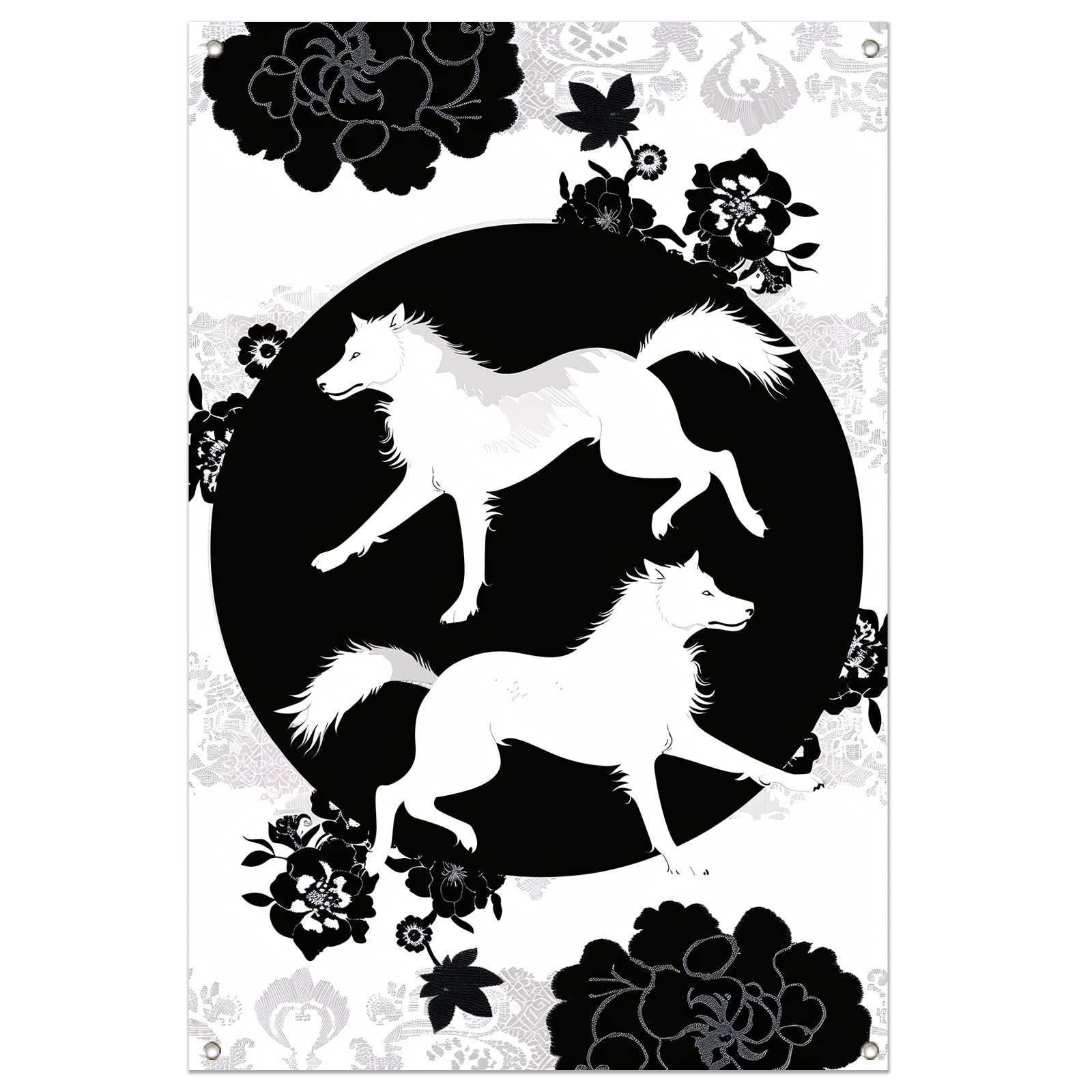 Zwart-wit silhouet van dansende wolven en bloemen tuinposter