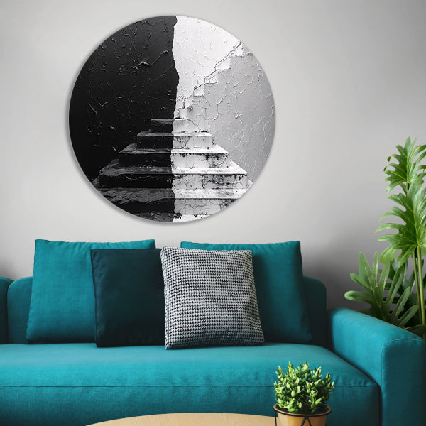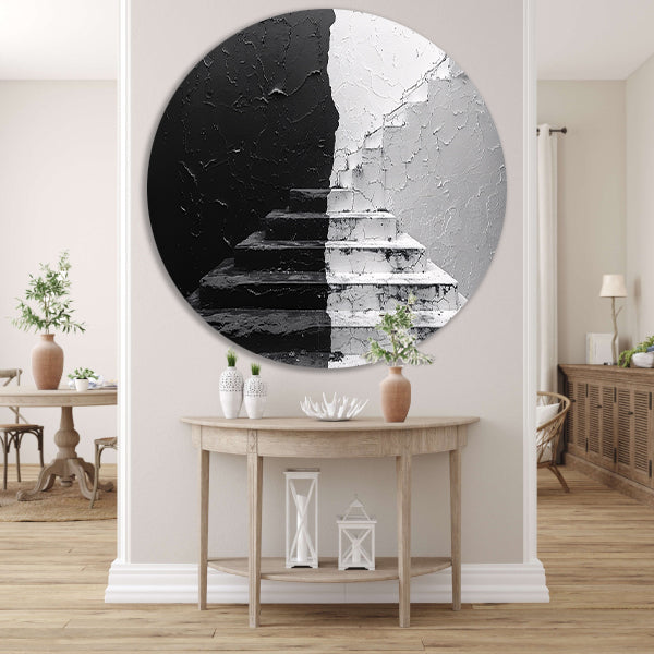 Het trappenhuis design in zwart wit zorgt voor een stijlvolle en moderne uitstraling in elke ruimte. Of je nu een gang, woonkamer of slaapkamer wilt verfraaien, deze muurcirkel past perfect bij elke inrichting. Bovendien is deze muurcirkel verkrijgbaar in meerdere formaten, zodat je de perfecte afmeting kunt kiezen voor jouw muur.