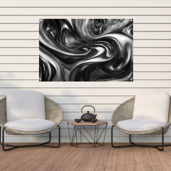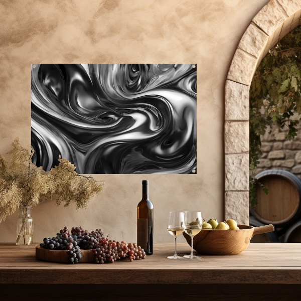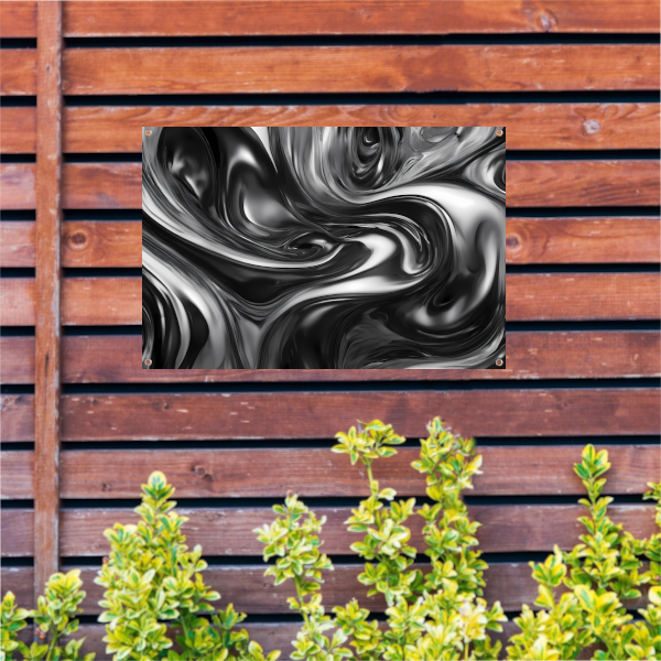 Het thema van deze tuinposter is abstractie, wat zorgt voor een speels en artistiek effect. De zwart-witte kleuren geven de poster een tijdloze uitstraling en passen goed bij verschillende tuinstijlen. De vloeiende patronen geven de poster een dynamisch en levendig karakter.