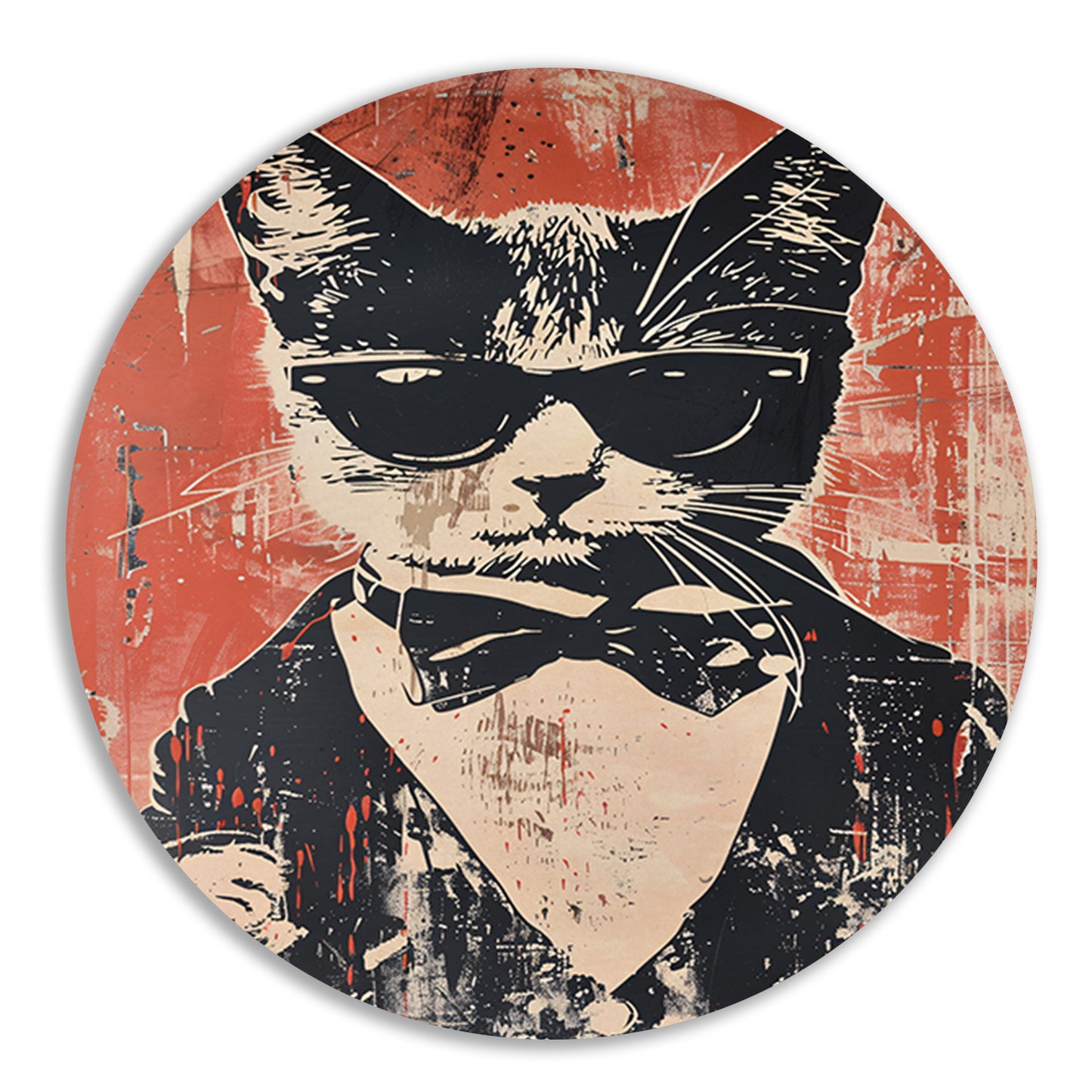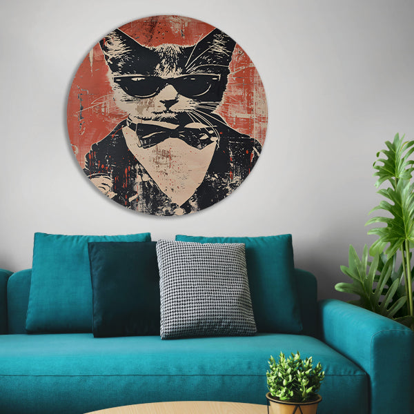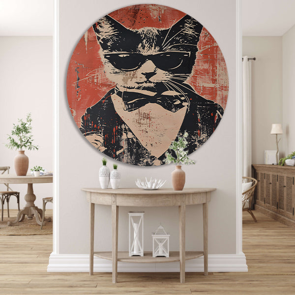 De zwart-witte kat met zonnebril en vlinderdas geeft een speelse en trendy touch aan elke ruimte. Of je hem nu in de woonkamer, slaapkamer of hal hangt, deze muurcirkel zal zeker de aandacht trekken van al je gasten. Bestel hem vandaag nog en geef jouw interieur een unieke en persoonlijke twist!