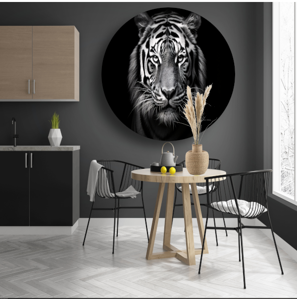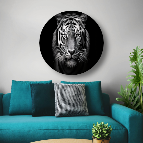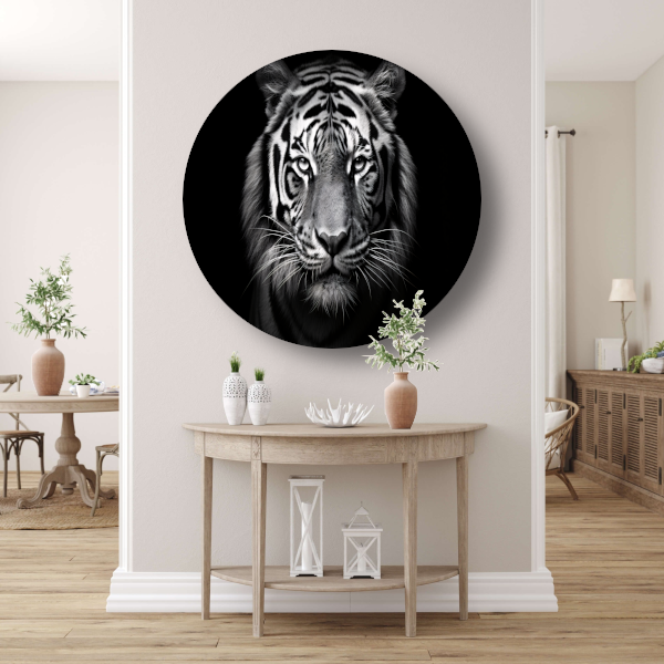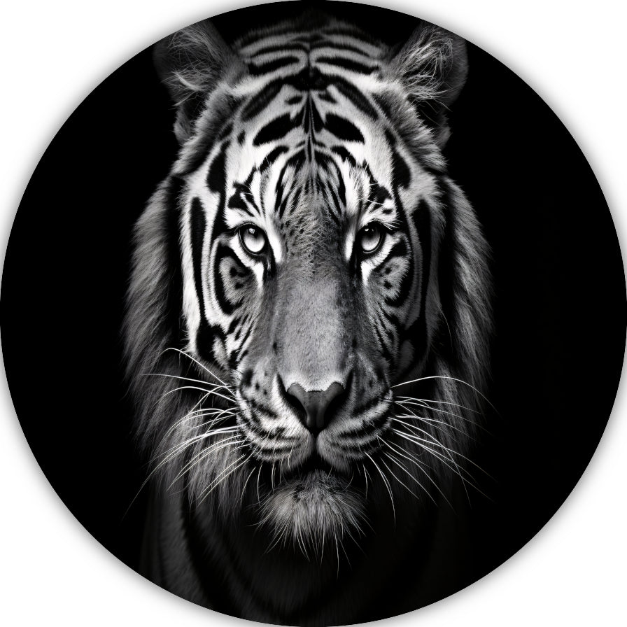 Zwart-witte tijgerportret, epressief aluminium muurcirkel