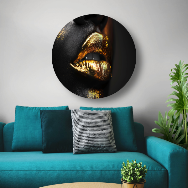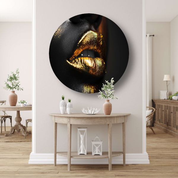 Voeg een vleugje glamour toe aan je interieur met deze prachtige zwarte achtergrond met gouden lippen muurcirkel. Perfect voor in de woonkamer, slaapkamer, kantoor of zelfs de hal. Bestel vandaag nog en geniet van een uniek en stijlvol kunstwerk aan jouw muur.