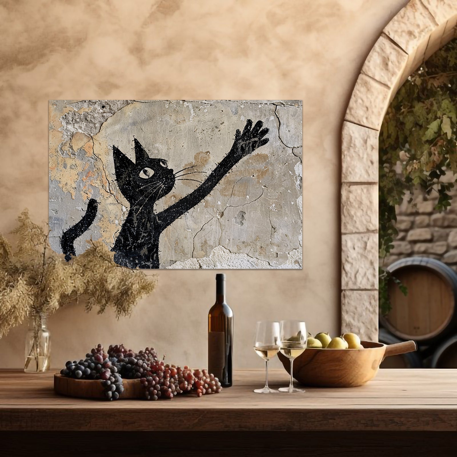 Zwarte kat op verweerde muur reikend omhoog tuinposter